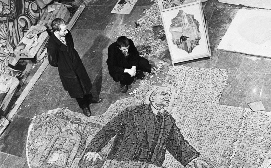 После развенчания культа личности, все изображения Сталина (а их было немало) в метрополитене были отредактированы. Такую вот метаморфозу претерпело панно на своде Комсомольской