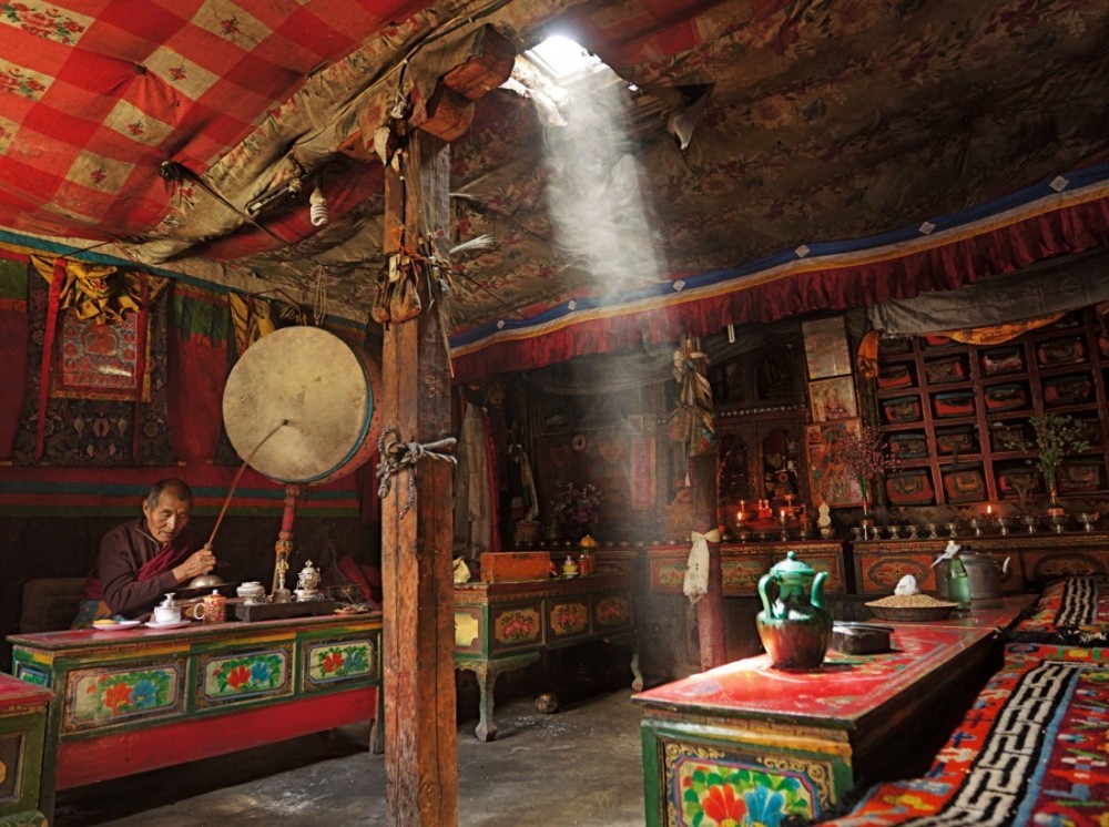 Тибетский лама Цеванг Таши ведет свою лошадь по деревне Самдзонг. По всей видимости, 800 лет назад в этом регионе было очень неспокойно, и местные жители в надежде обрести безопасность переселялись в недоступные горные пещеры. В деревню вернулись только их очень далекие потомки. “Если вы не доверяете соседям, пещера для вас – отличный выбор”, – уверен археолог Марк Алдендерфер.