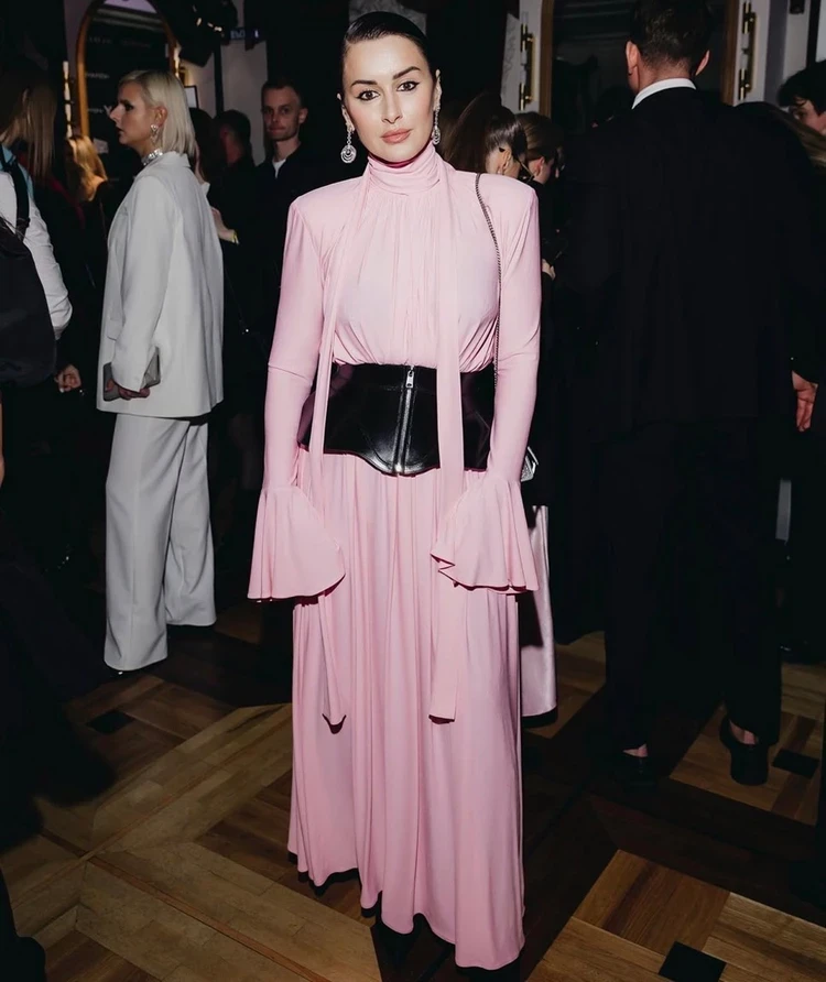 Жгучей брюнетке Тине Канделаки идут все оттенки розового. Так, на одном из мероприятий продюсер появилась в нежно-розовом длинном платье с увеличенной линией плеч и рукавами воланами. Наряд эффектно дополнила кожаная баска, с помощью которой Тина подчеркнула талию. Образ Канделаки дополнила оригинальными сережками и серебристой сумочкой.