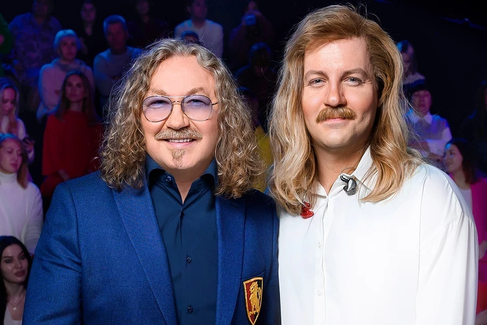 Член жюри «Один в один» Игорь Николаев и Арсений Бородин, который будет его изображать и споет «Выпьем за любовь». Фото — телеканал «Россия».