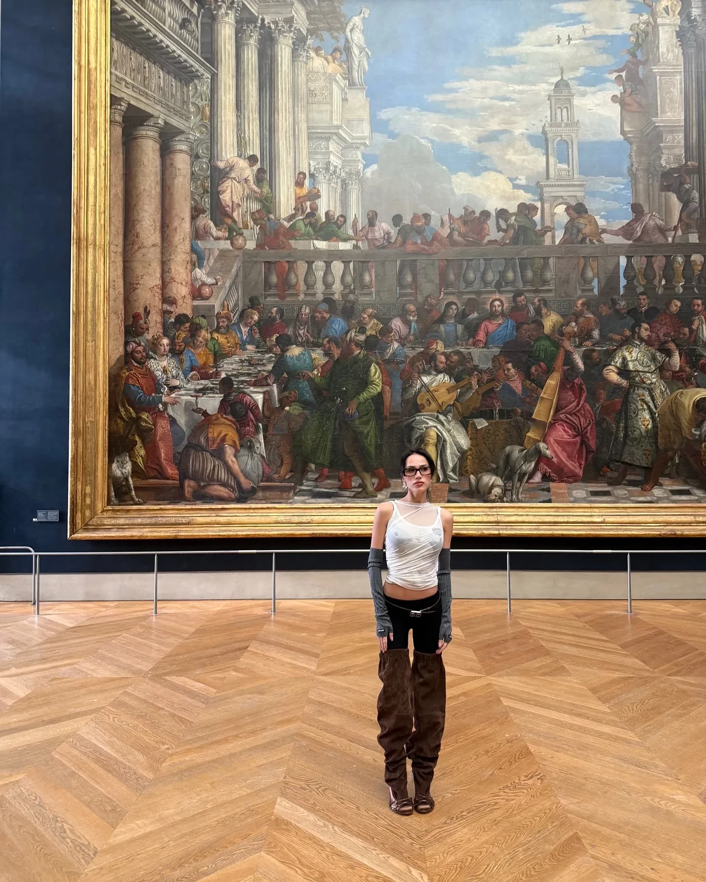 На фото Загитова позирует на фоне знаменитого полотна Паоло Веронезе "Брак в Кане Галилейской", а также рядом с картиной Леонардо да Винчи "Мона Лиза", где попыталась воспроизвести знаменитую улыбку "Джоконды". Для посещения музея спортсменка выбрала полупрозрачную майку, трендовые коричневые ботфорты и очки в толстой оправе.