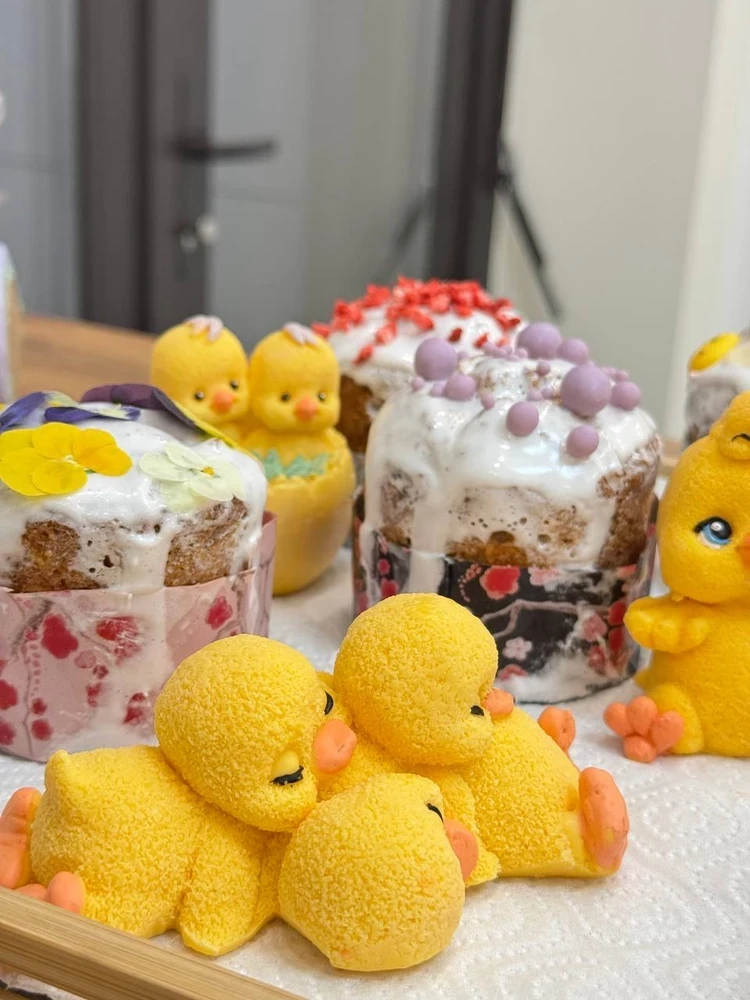 Звездная мама украсила получившиеся куличи фигурками белых зайцев и желтых цыплят.