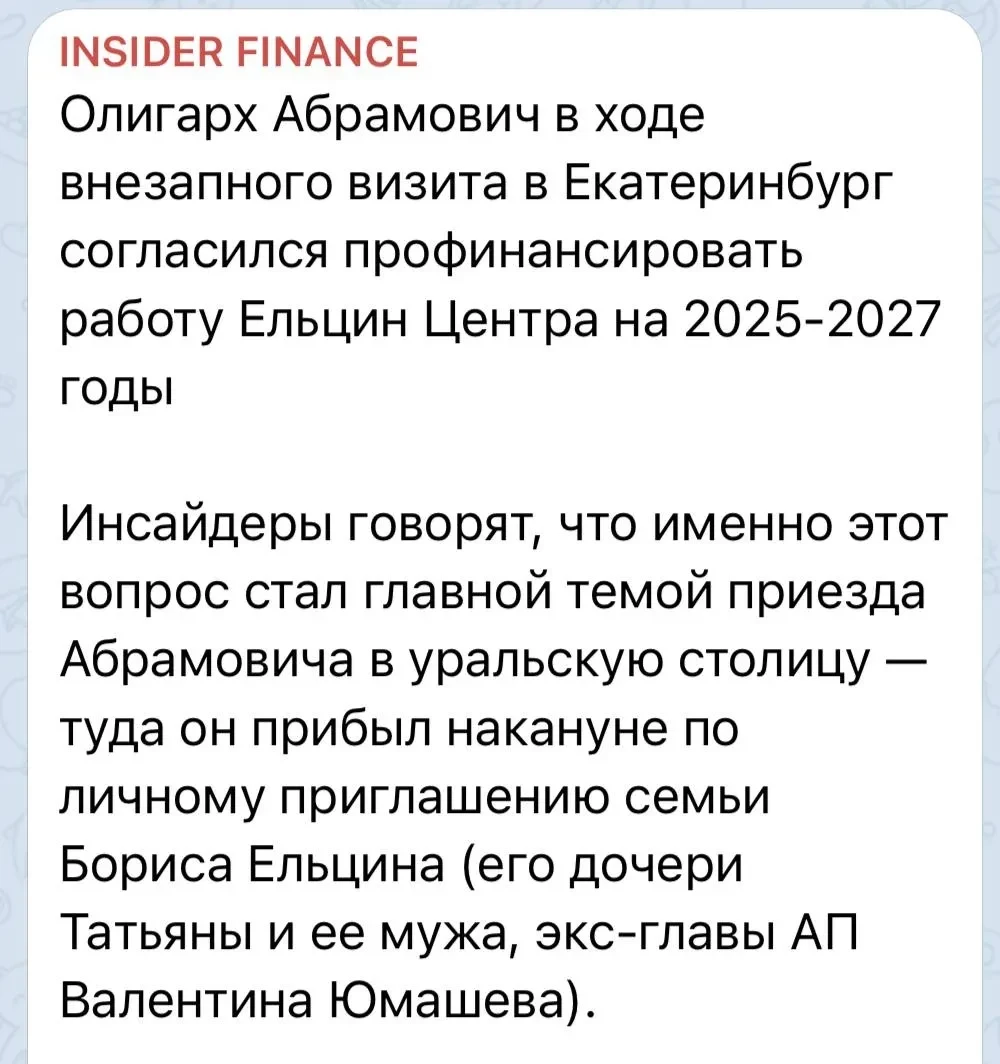 58-летний миллиардер Роман Абрамович, который недавно прилетел в Екатеринбург, по слухам, проспонсировал работу "Ельцин Центра" на 2025—2027 годы. Об этом сообщает телеграм-канал Insider Finance со ссылкой на источники.