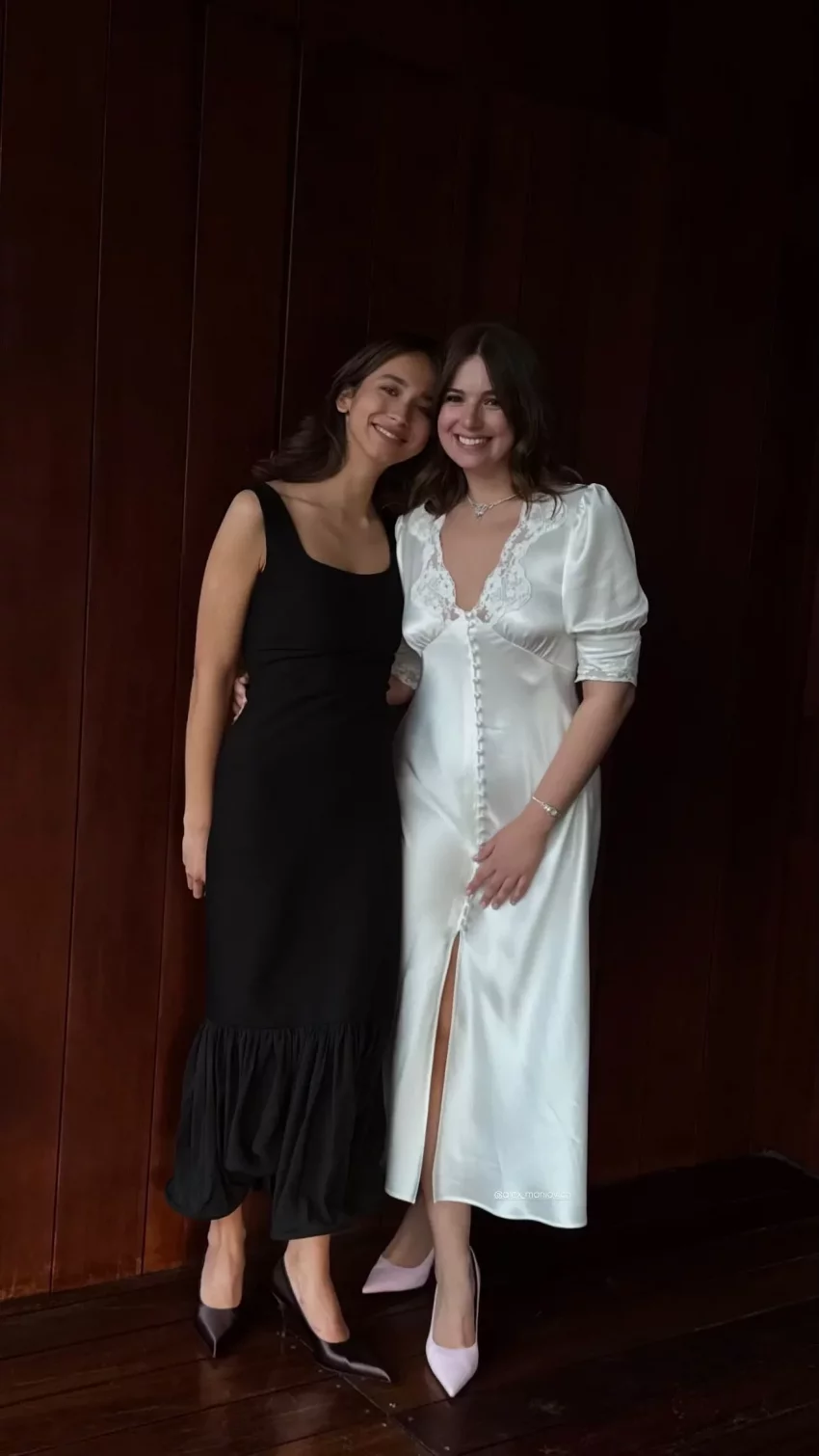 Александра выбрала для церемонии белое платье с рукавом три четверти от британского бренда Rixo. Она дополнила наряд нежно-розовыми туфлями с острым носом, бриллиантовым колье и серьгами. Свадебный букет состоял из белых калл, а вместо привычной ленты были использованы жемчужные бусы.