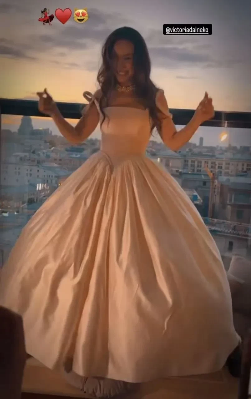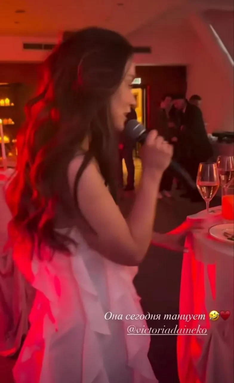 К гостям невеста вышла в белом атласном платье с корсетом, её волосы были распущены, а из аксессуаров на ней было жемчужное колье. На женихе был синий классический костюм. Для вечеринки после регистрации Дайнеко переоделась в более удобный наряд.
