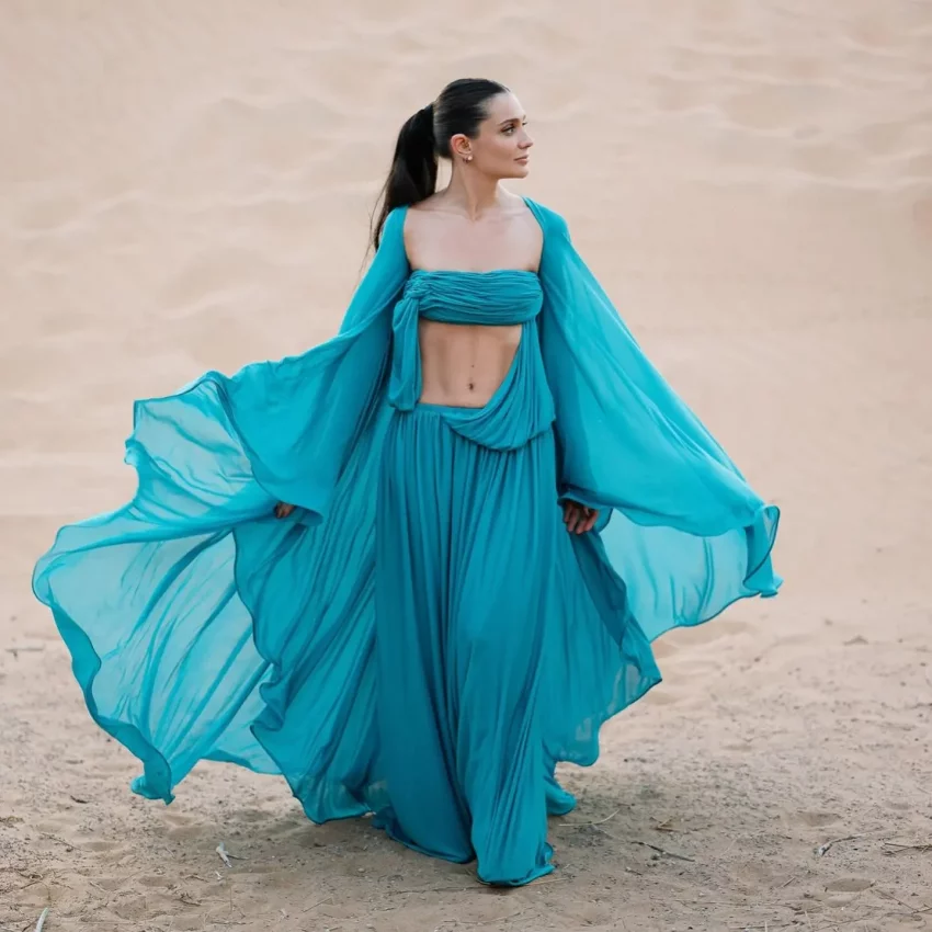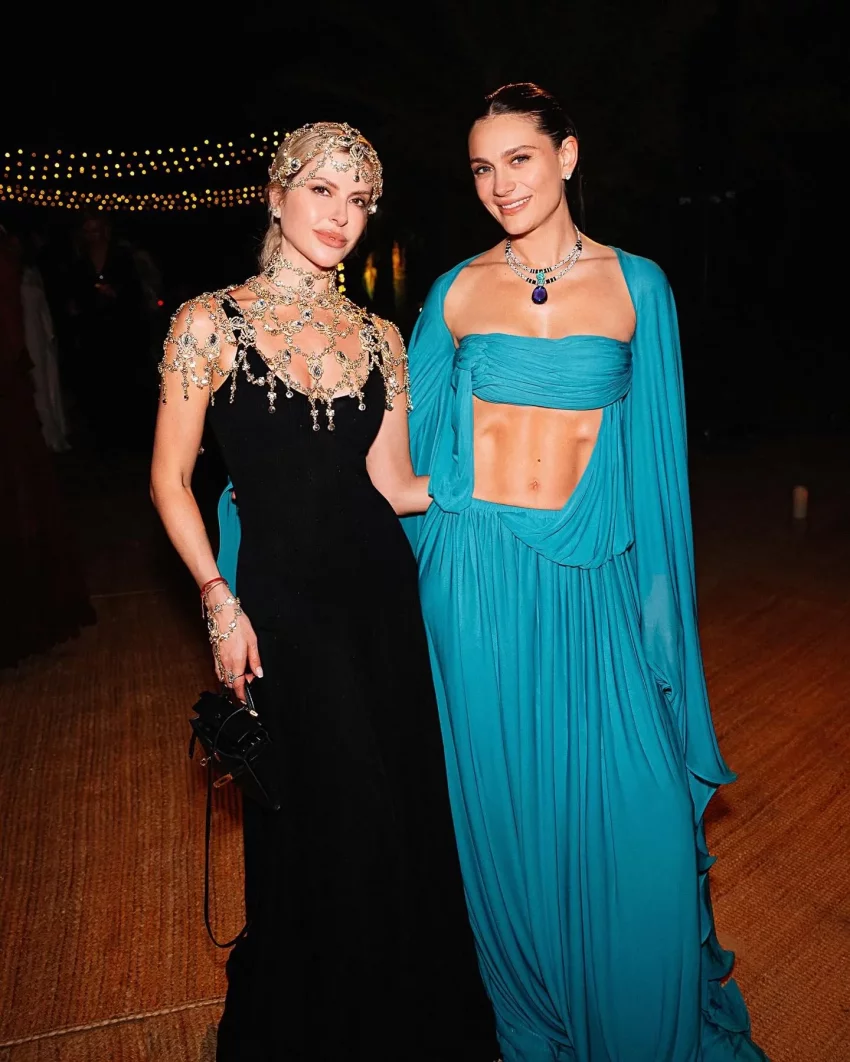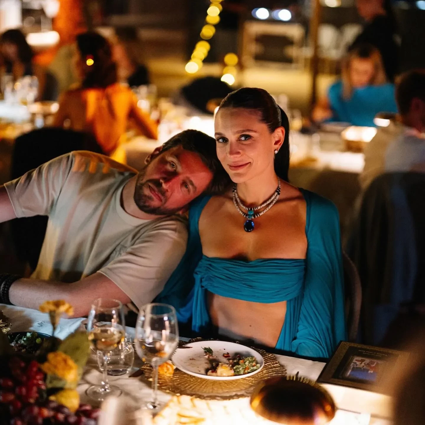 Тимур Сардаров и Екатерина ДармаДля торжества Дарма выбрала наряд в восточном стиле, отсылающий к принцессе Жасмин: она надела голубое струящееся платье-макси с накидными рукавами от Christopher Esber, дополнив образ колье Cartier и минималистичными серьгами. Волосы Екатерина собрала в гладкий хвост, а в макияже сделала акцент на естественную красоту.
