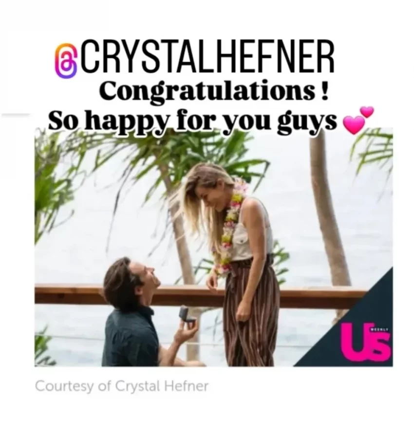 Кристал Хефнер с женихомРанее она высказалась в подкасте Hit Network Carrie and Tommy о Леонардо ДиКаприо, который, по её словам, "превращается в нового Хефа".