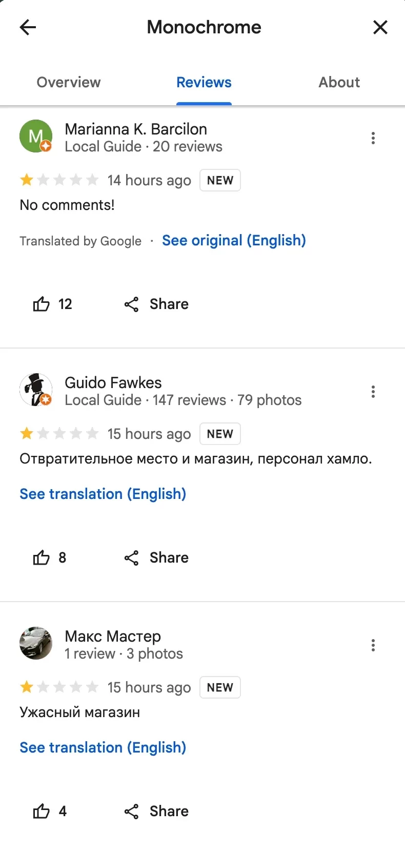 Последние отзывы на магазин Monochrome в картах GoogleВскоре бренд удалил комментарии. Богданович от себя лично извинился "за тон, подачу, форму и формулировку публикации, вызвавшей очевидный и понятный мне негатив".