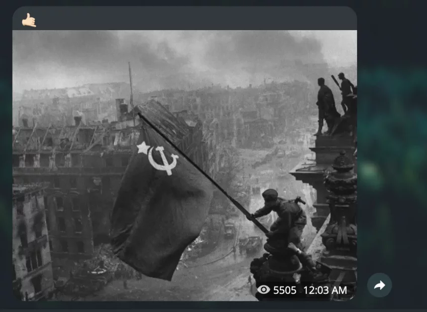 После этого Алиса Боха, которая, как оказалось, ведёт официальный телеграм-канал бренда, переименовала свой личный канал, удалив всю информацию, и опубликовала единственное фото советского флага над Рейхстагом.