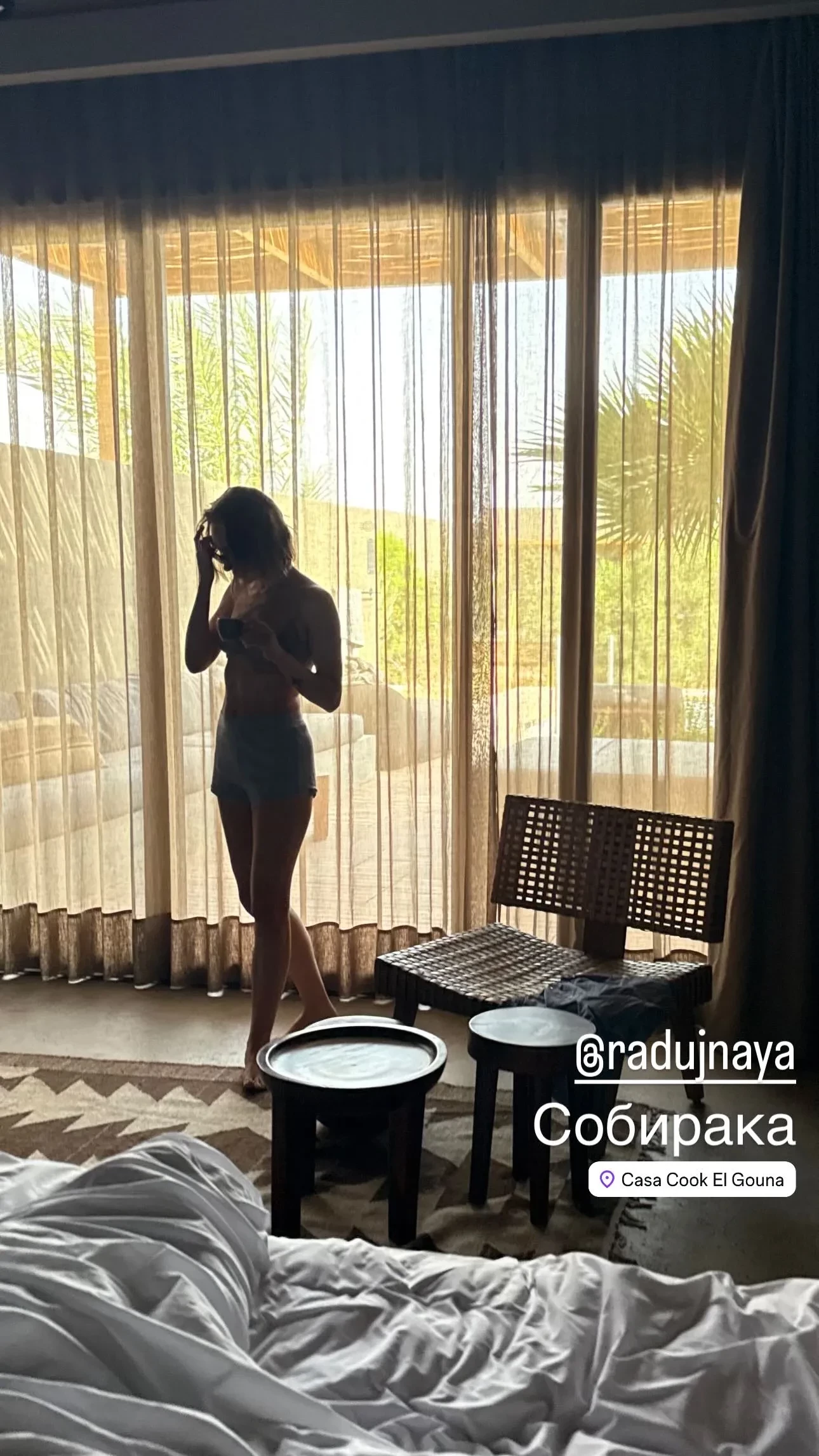 На одном из фото Табаков и Ермоленко обнимаются на пляже, на другом Павел сфотографировал Ксению в номере отеля.