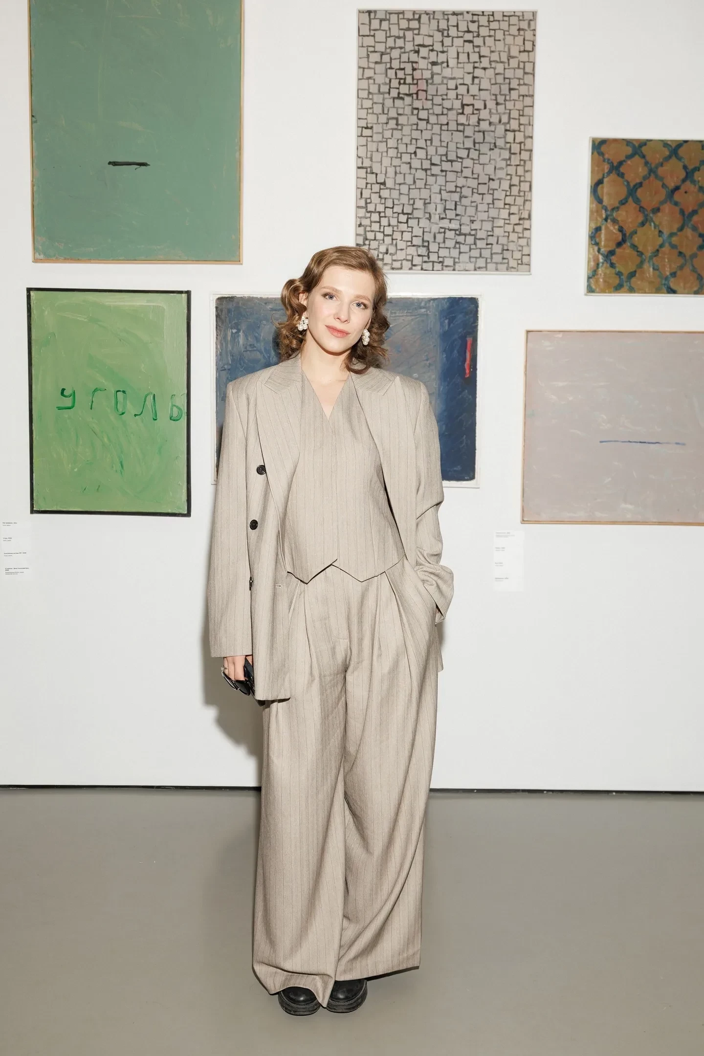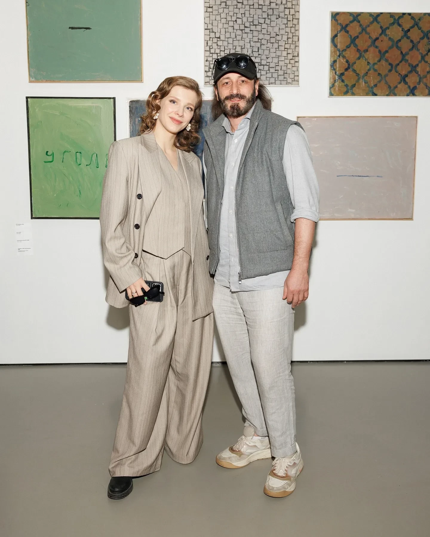 Для мероприятия Елизавета выбрала серый брючный костюм, дополнив образ белыми серьгами и массивными чёрными ботинками. Авербух был одет в светло-серые брюки, рубашку и жилетку.