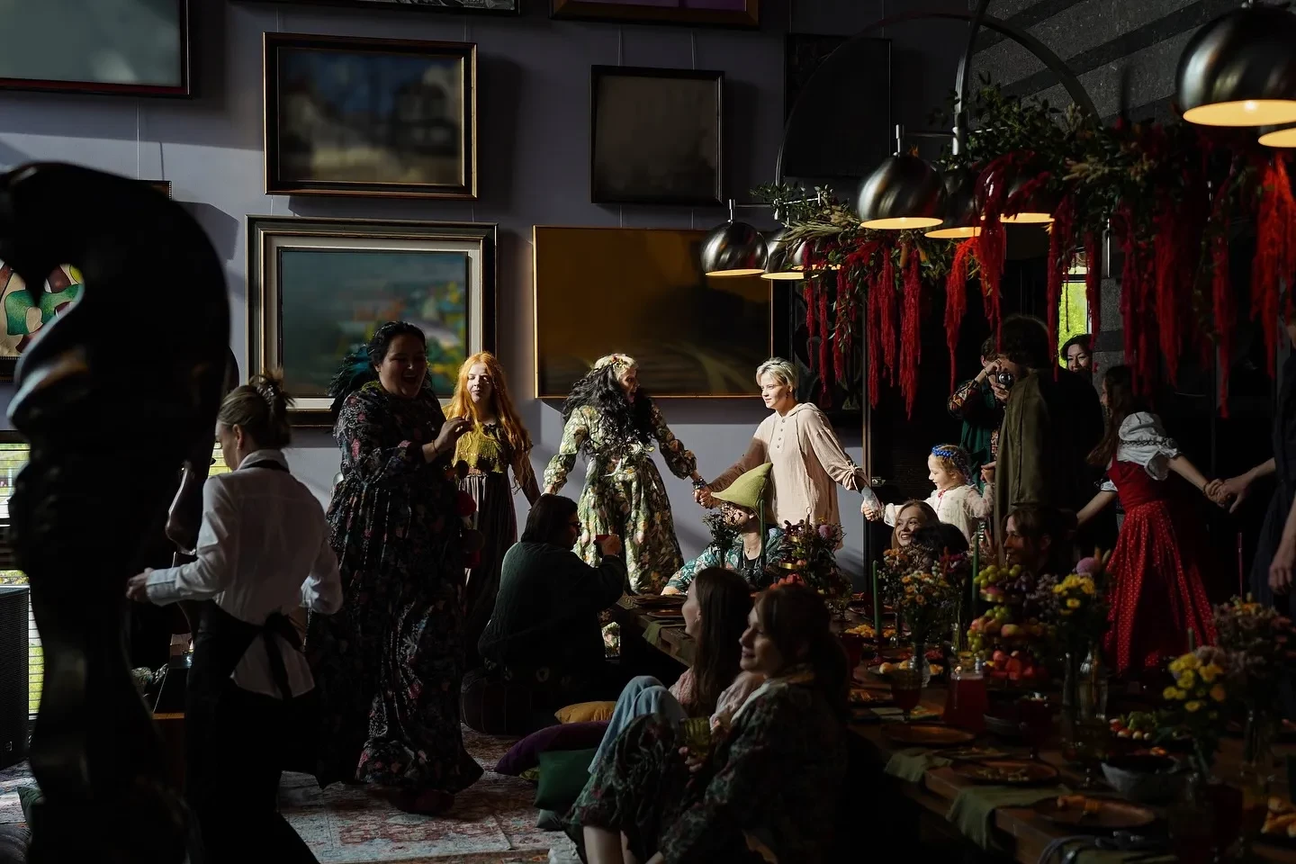 Судя по фото, опубликованным в инстаграме*, торжество прошло в стиле средневекового фэнтези: за музыку отвечала медивал-фолк-группа "Огни Новиграда", в волосы гостям вплетали живые цветы, в оформлении использовались природные мотивы, а по территории гуляли настоящие козлята. В программе, помимо классического пира и хороводов, были прогулки на лодках по озеру и баня.