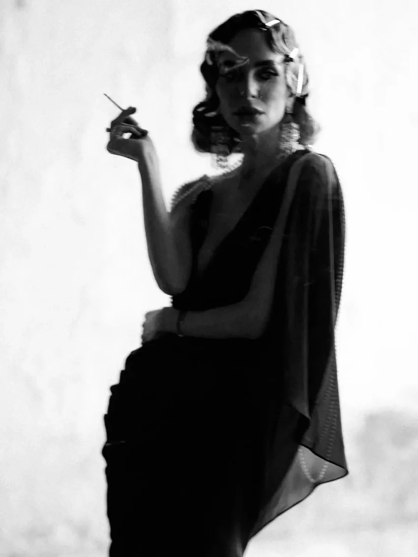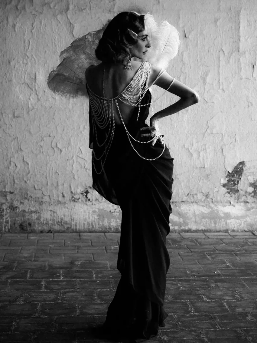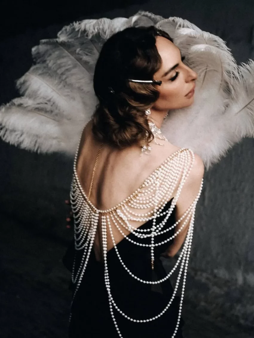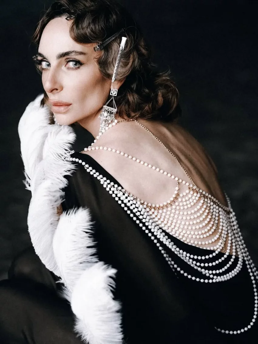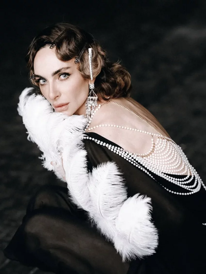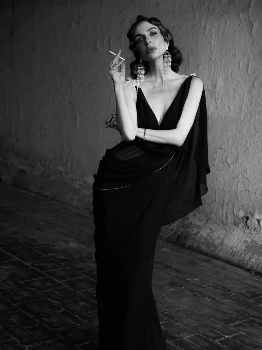 Екатерина Варнава снялась в новой фотосессии в стиле старого Голливуда. 40-летняя актриса опубликовала снимки в соцсетях, на которых она позирует в чёрном платье Say No More с глубоким декольте и украшениях Dzhanelli. Образ екатерины дополняет веер из перьев и укладка в стиле 1930-х.