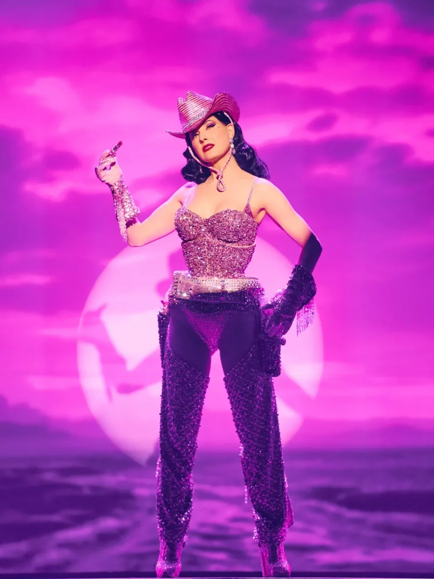 Дита фон Тиз в шоу "Бриллианты и пыль"Ранее Дита фон Тиз повторила свой культовый номер "Бокал мартини", в котором станцевала обнажённой в гигантском бокале. Дита впервые показала этот номер публике в 1993 году, когда только начинала карьеру танцовщицы бурлеска.