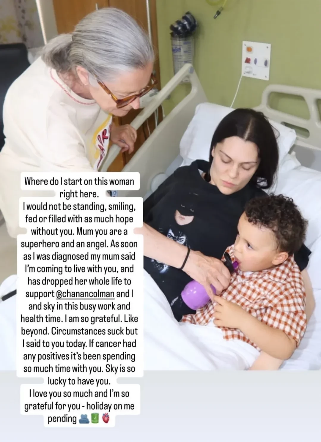 Джесси Джей с мамой и сыномДжесси выразила не только огорчение в связи с тем, что ей приходится переживать, но и признательность своим близким людям. Она поблагодарила своего возлюбленного Чанана Колмана за то, что он выполняет роль сиделки и свои отцовские обязанности, а также свою маму, которая переехала к дочери, чтобы помочь ей с сыном. Напомним, что Джесси родила сына Ская в 2023 году. До этого врачи диагностировали у неё бесплодие.