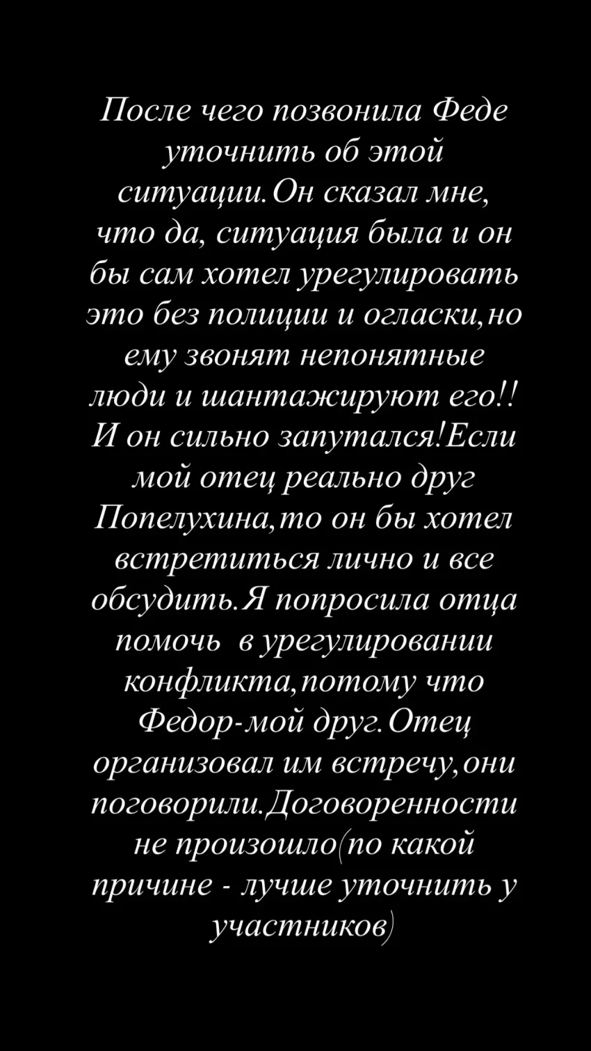 Так, Дарья рассказала, что один из пострадавших, бизнесмен Андрей Попелуха, является другом её отца. После инцидента Попелуха, желая уладить ситуацию без привлечения правоохранительных органов, якобы связался с Русланом Валитовым и поинтересовался, знает ли тот Смолова. Отец Дарьи, в свою очередь, обратился к ней, чтобы уточнить, в каких отношениях она находится с футболистом. "Я позвонила Феде, чтобы уточнить об этой ситуации. Он сказал мне, что ситуация была, он бы сам хотел урегулировать это без полиции и огласки, но ему звонят непонятные люди и шантажируют его. И он сильно запутался", — отметила Валитова.