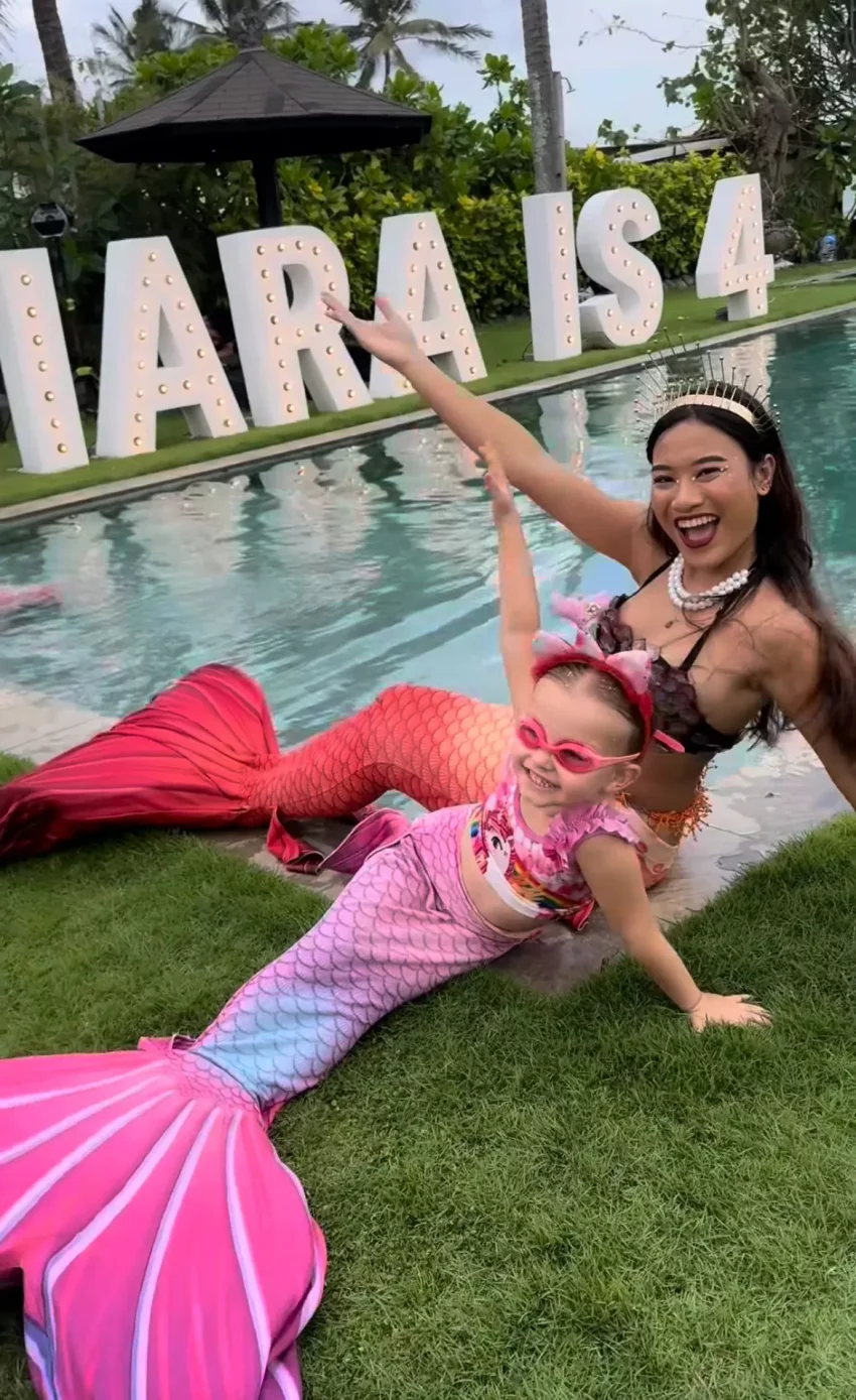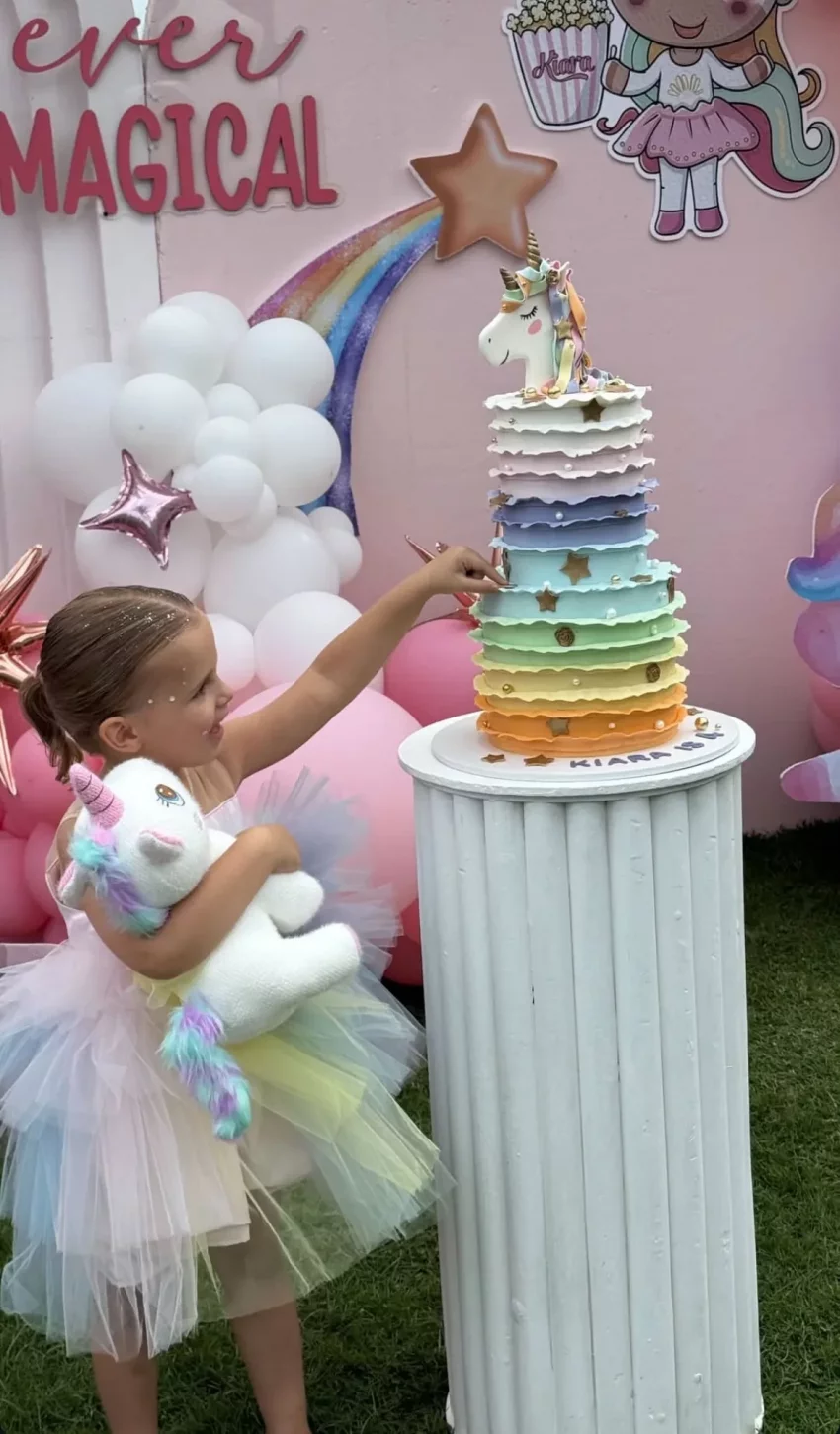 Кафельникова, которая недавно снялась в кампейне Vivienne Westwood, устроила для дочери вечеринку у бассейна. Территорию украсили надувной замок и множество воздушных шаров. Киара примерила на себя образ русалки и задула свечи на разноцветном торте с единорогом.