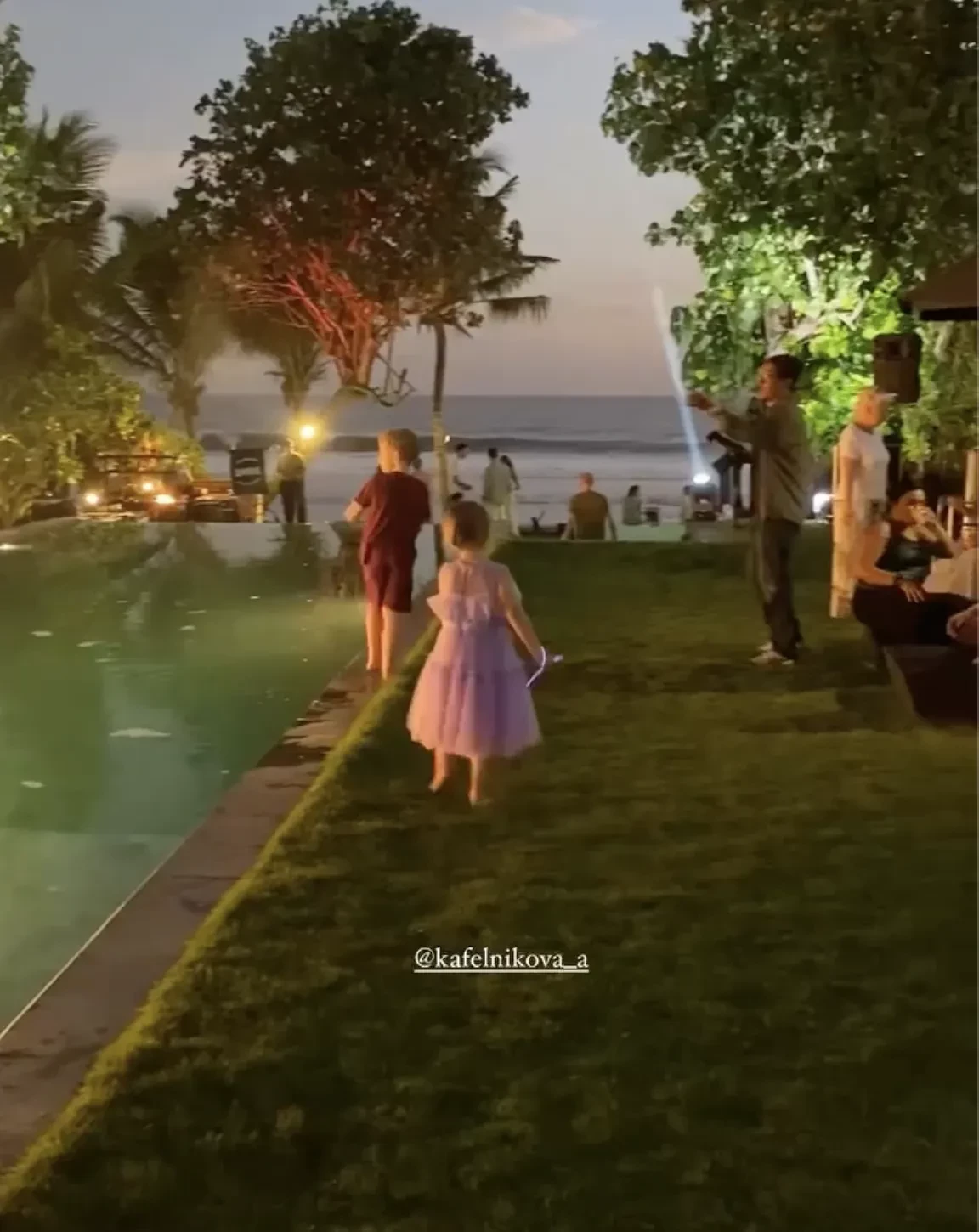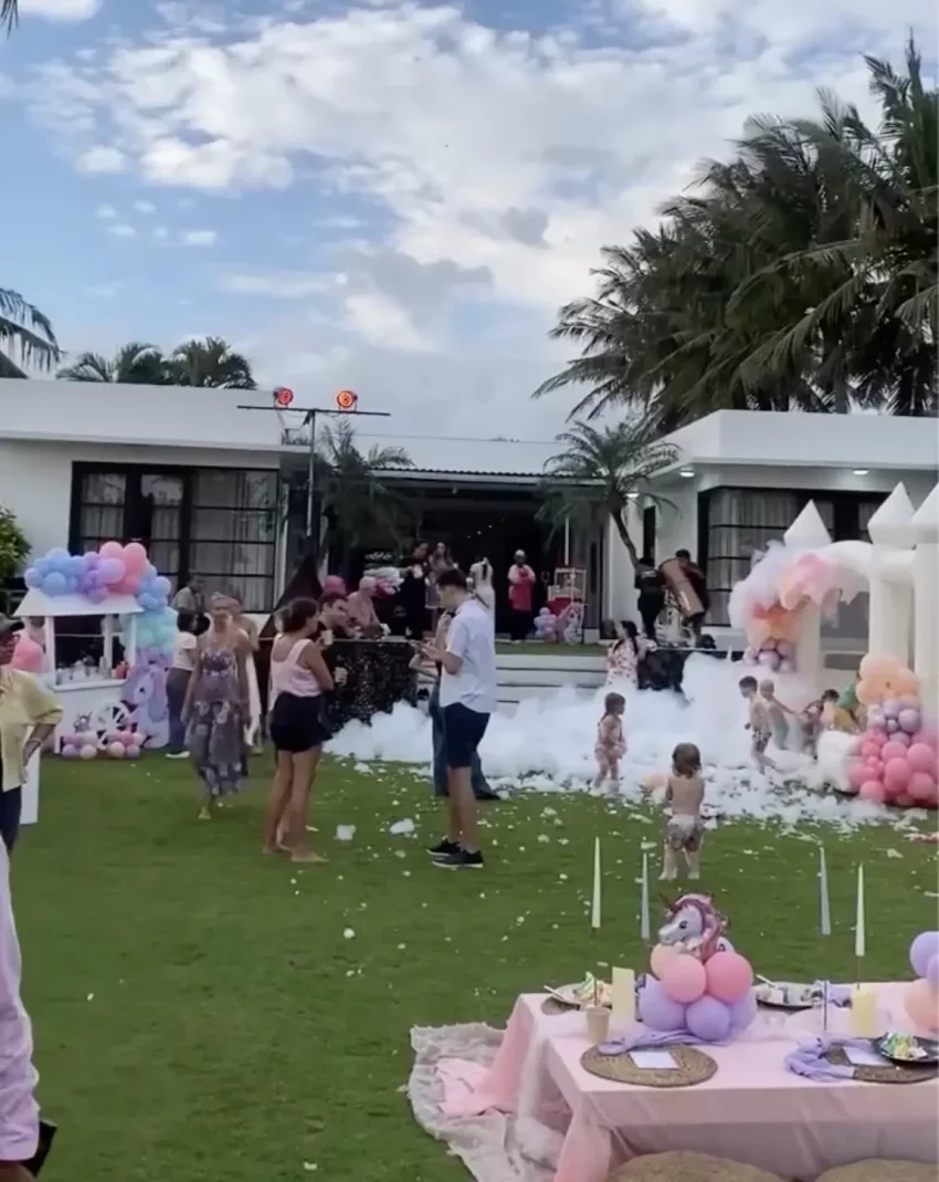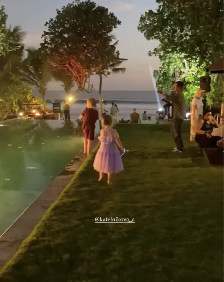 Алеся Кафельникова и Георгий Петришин с дочерьюАлеся Кафельникова и Георгий Петришин с дочерьюАлеся Кафельникова и Георгий Петришин с дочерьюДень рождения Киары прошёл на берегу океана, предположительно на Бали, где Кафельникова часто живёт с семьёй. Территорию у бассейна украсили надувной замок и воздушные шары. Детей и взрослых развлекали аниматоры-русалки, угощали разноцветным тортом, а вечером был фейерверк на пляже.