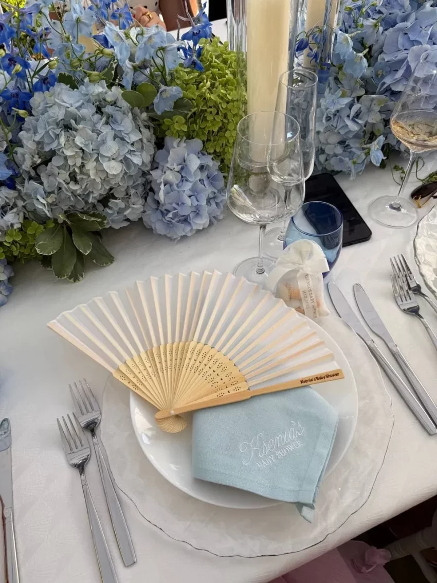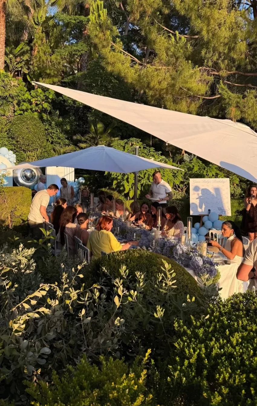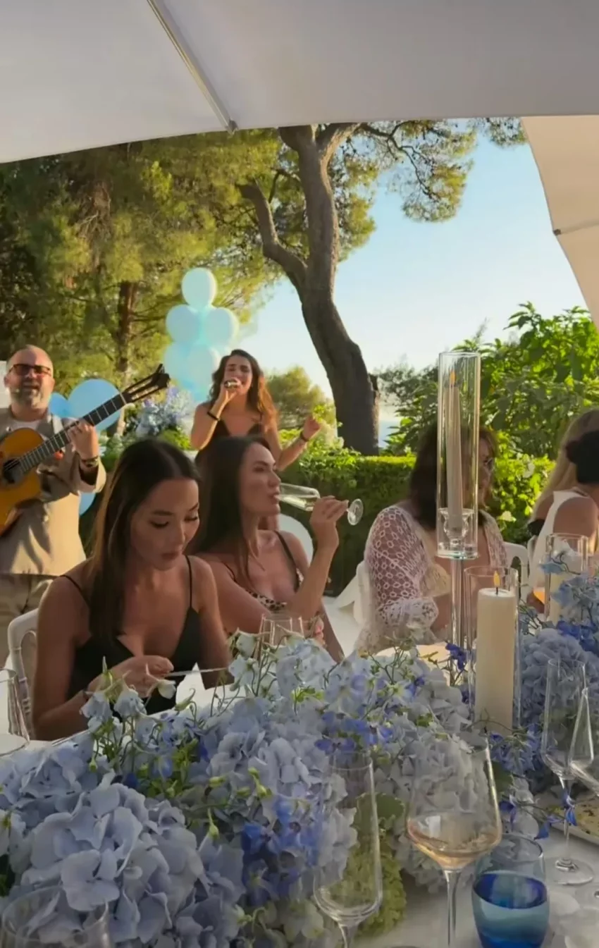 Праздник проходил на Лазурном Берегу, на курорте Сен-Жан-Кап-Ферра́ на юго-востоке Франции. Среди прочих, его посетила журналистка Алёна Бердова, она же поделилась фотографиями с мероприятия. Судя по декорациям на вечеринке: голубые шары, цветы и посуда на столах, Ксения ждёт мальчика. Платье на Сухиновой тоже было нежно-голубого цвета.