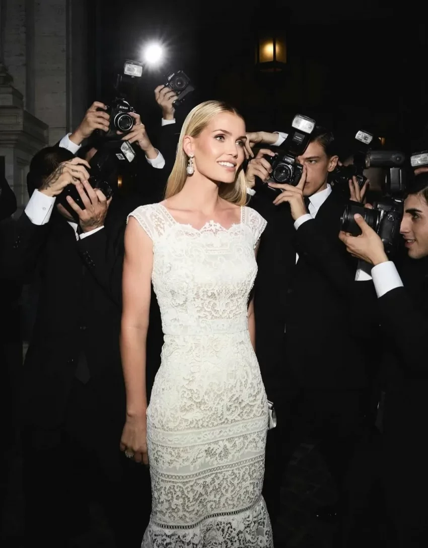Появление Китти на вечеринке вышло эффектным: она приехала на винтажном жёлтом "фиате". В своих соцсетях Спенсер продемонстрировала свой образ в тот вечер: белое кружевное платье миди, в тон к которому она подобрала туфли и клатч.