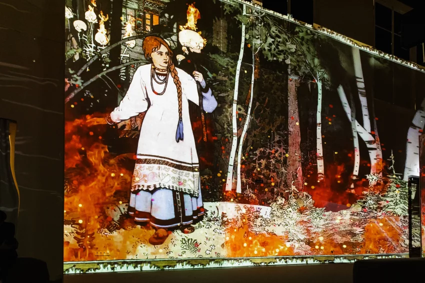 Катерина ШпицаПервым проектом в обновлённом здании стала мультимедийная выставка "За тридевять земель", посвящённая главному музейному тренду последних лет — русскому культурному коду. Более ста шедевров русской живописи конца XIX — начала XX века, среди которых работы Васнецова, Левитана, Билибина, Врубеля, Куинджи, Рериха, Шишкина, Васильева, Нестерова и Айвазовского, "ожили" благодаря современным технологиям: искусственный интеллект и саунд-дизайн превратили полотна в виртуальное путешествие по сказочным мирам. Каждую картину сопровождает свой звукоряд (шорохи леса, шелест трав, голос ветра и даже тревожный хруст веток за спиной), который помогает создать эффект полного погружения.
