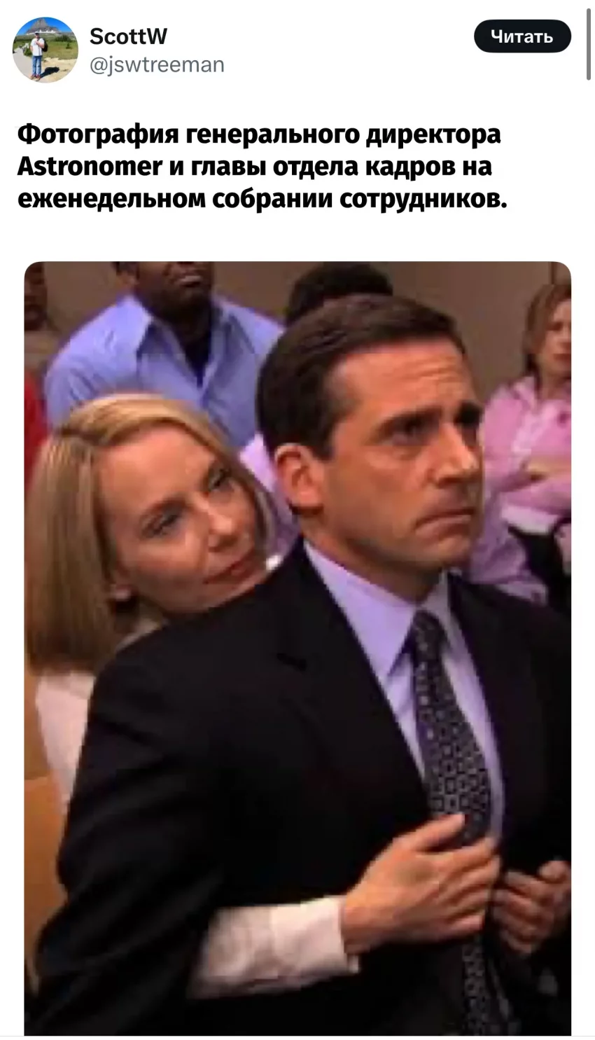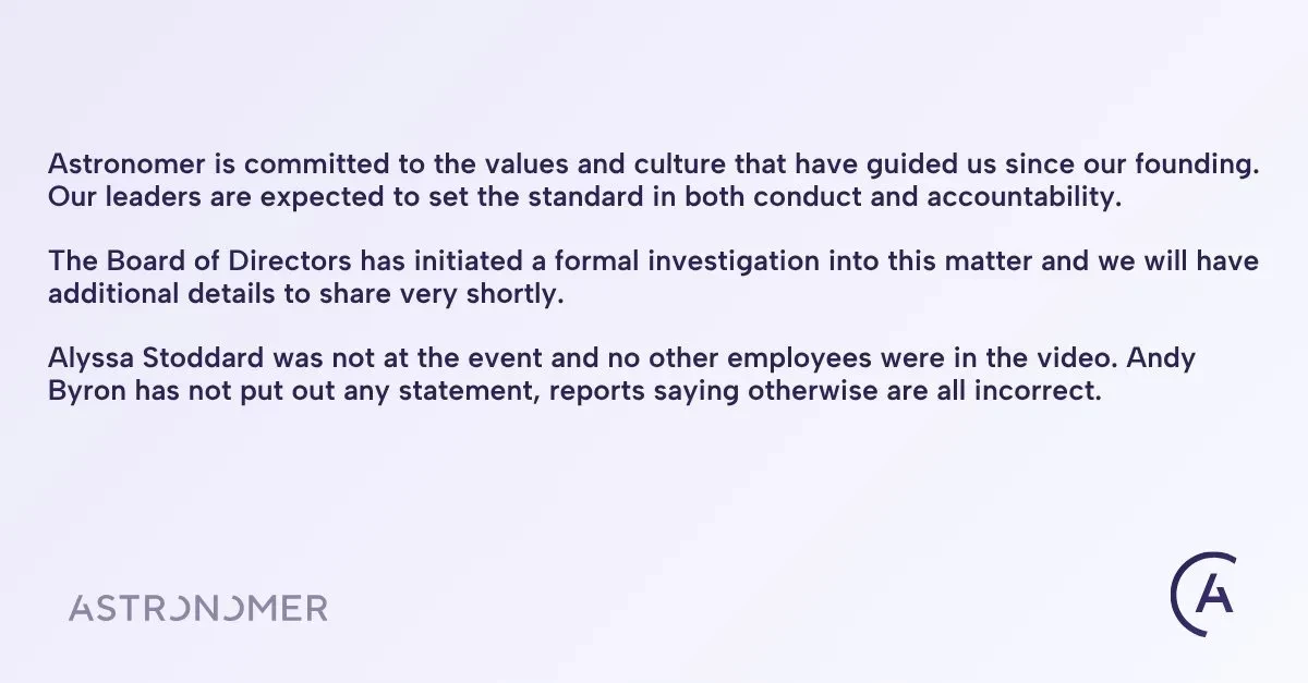 "Astronomer придерживается ценностей и культуры, заложенных с момента основания. Мы ожидаем, что наши руководители задают высокие стандарты поведения и подотчётности. Совет директоров уже инициировал официальное расследование, и в ближайшее время мы расскажем больше. Подчёркиваем: ни один сотрудник компании не попал на видео", — заявили в Astronomer.