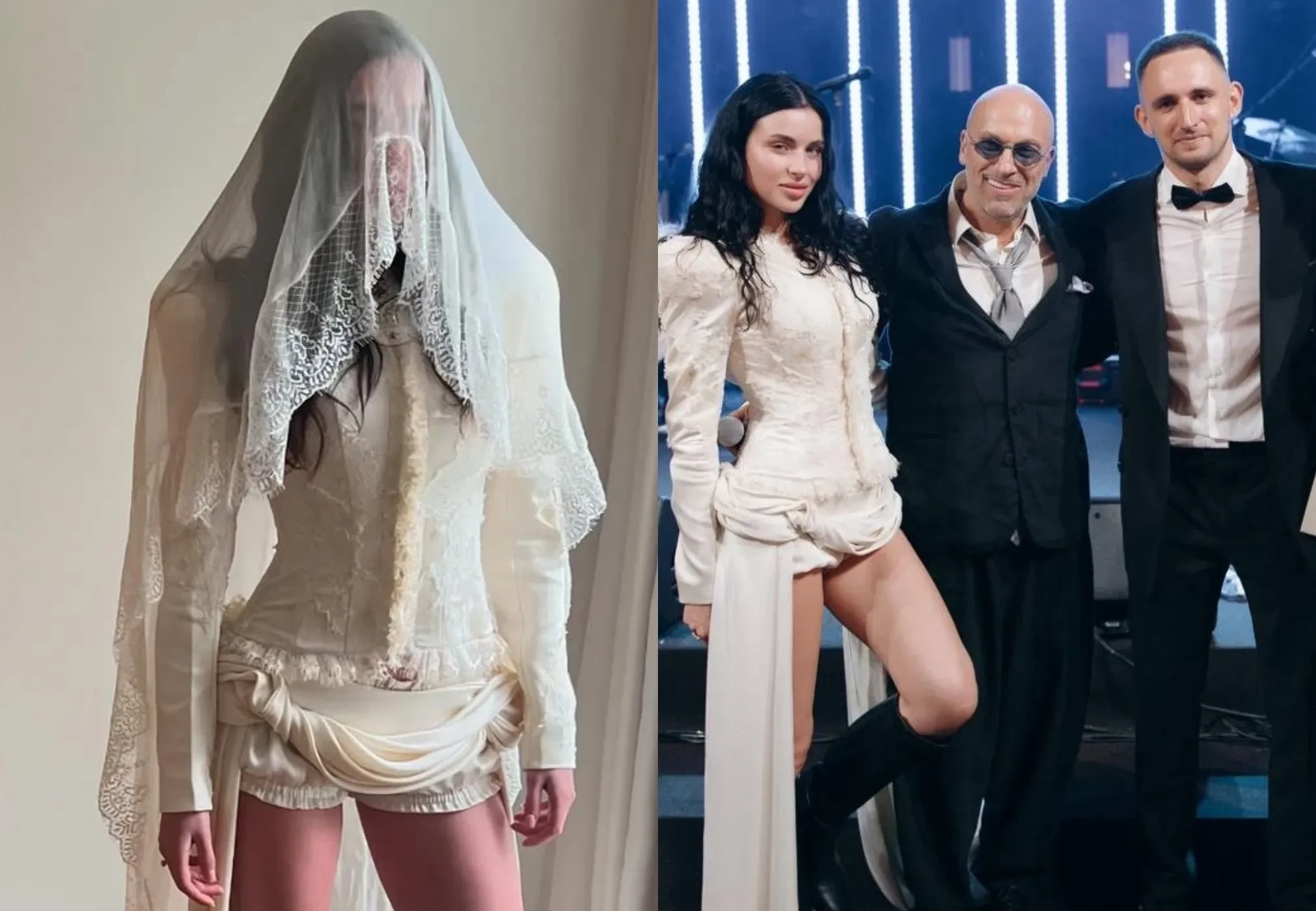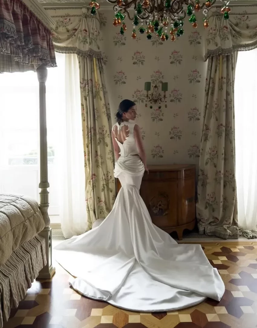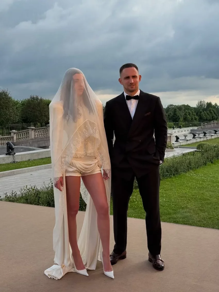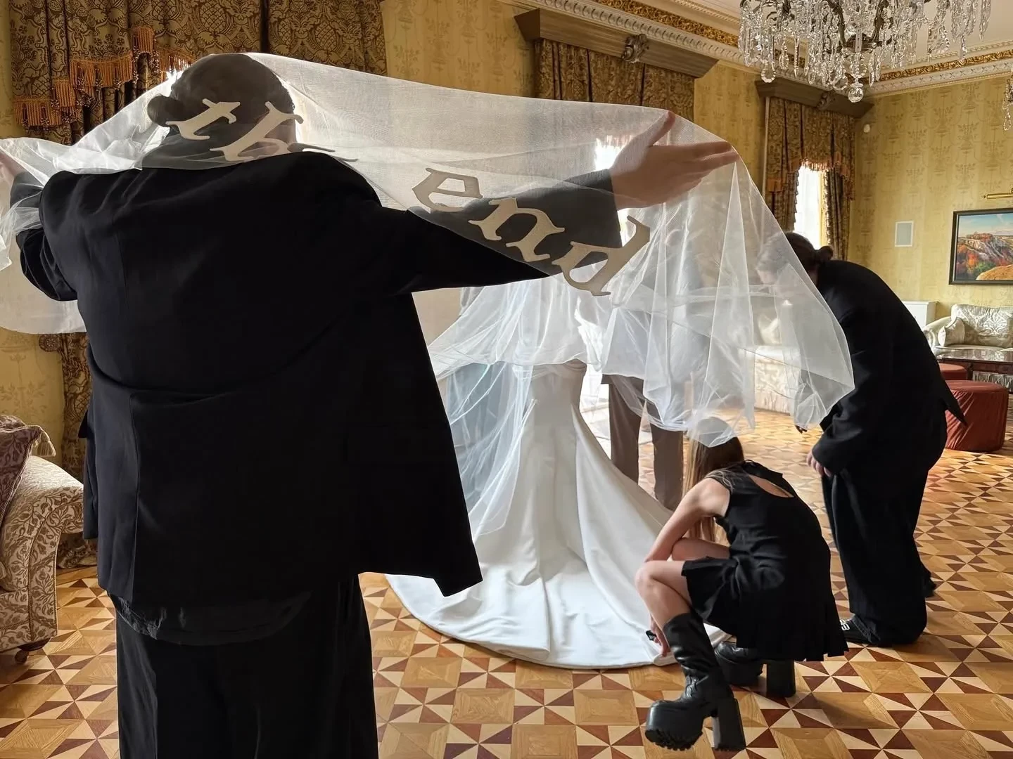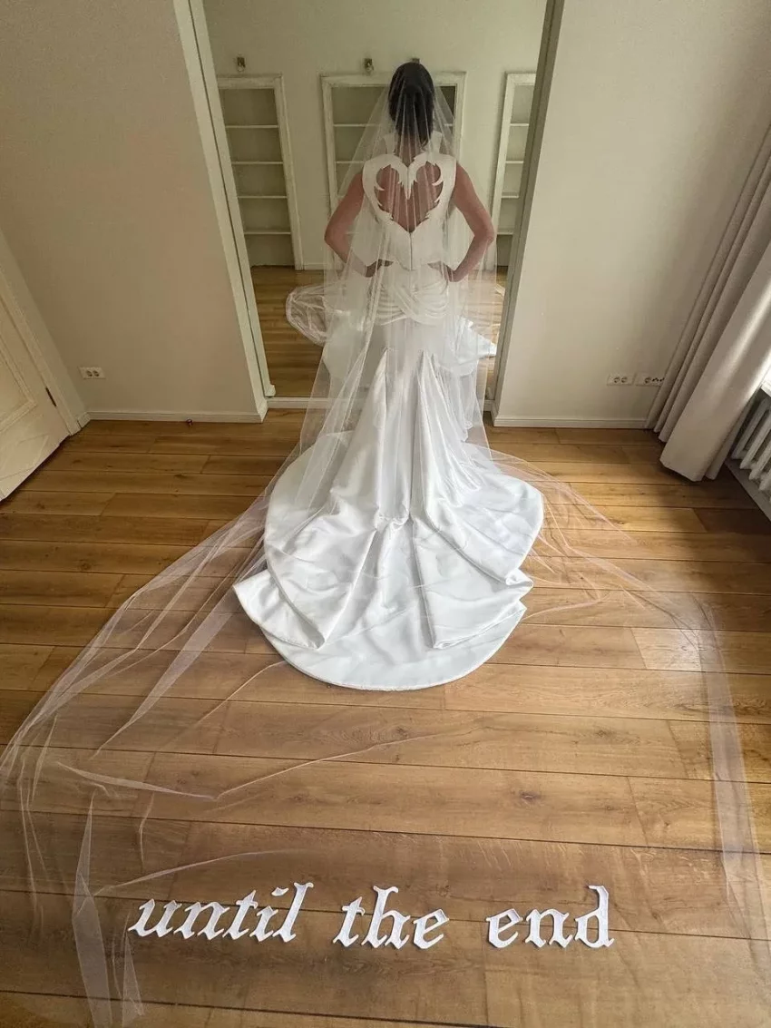 Адель ВейгельОсновную часть церемонии невеста провела в платье Belik с вырезом в форме сердца на спине и длинной фатой с надписью Until the end ("До конца"). Похожий свадебный образ был у Хейли Бибер в 2018 году, только на её фате была вышита фраза Till Death Do Us Part ("Пока смерть не разлучит нас").