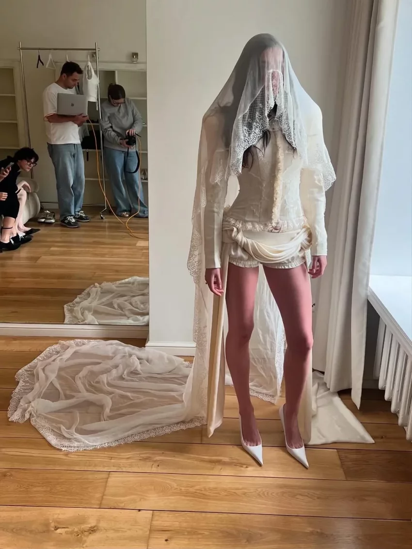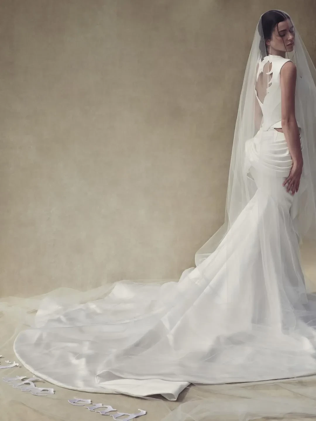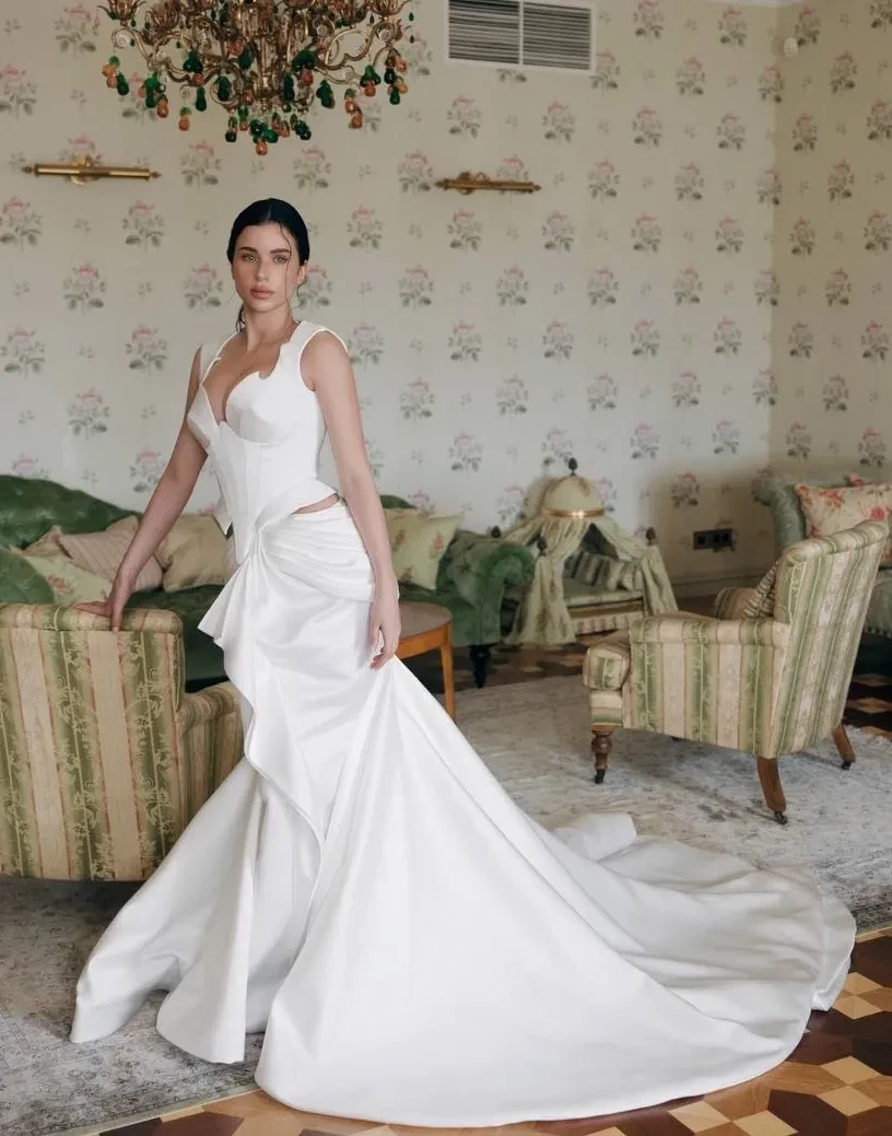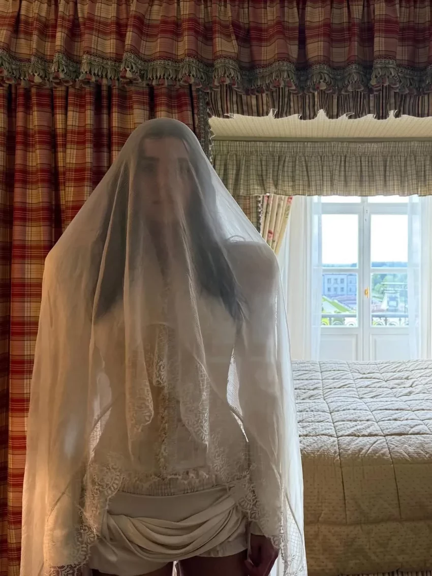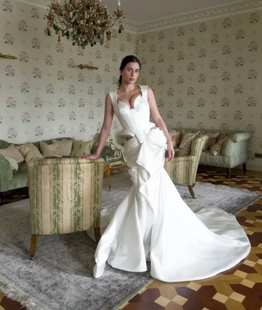 Адель ВейгельОсновную часть церемонии невеста провела в платье Belik с вырезом в форме сердца на спине и длинной фатой с надписью Until the end ("До конца"). Похожий свадебный образ был у Хейли Бибер в 2018 году, только на её фате была вышита фраза Till Death Do Us Part ("Пока смерть не разлучит нас").