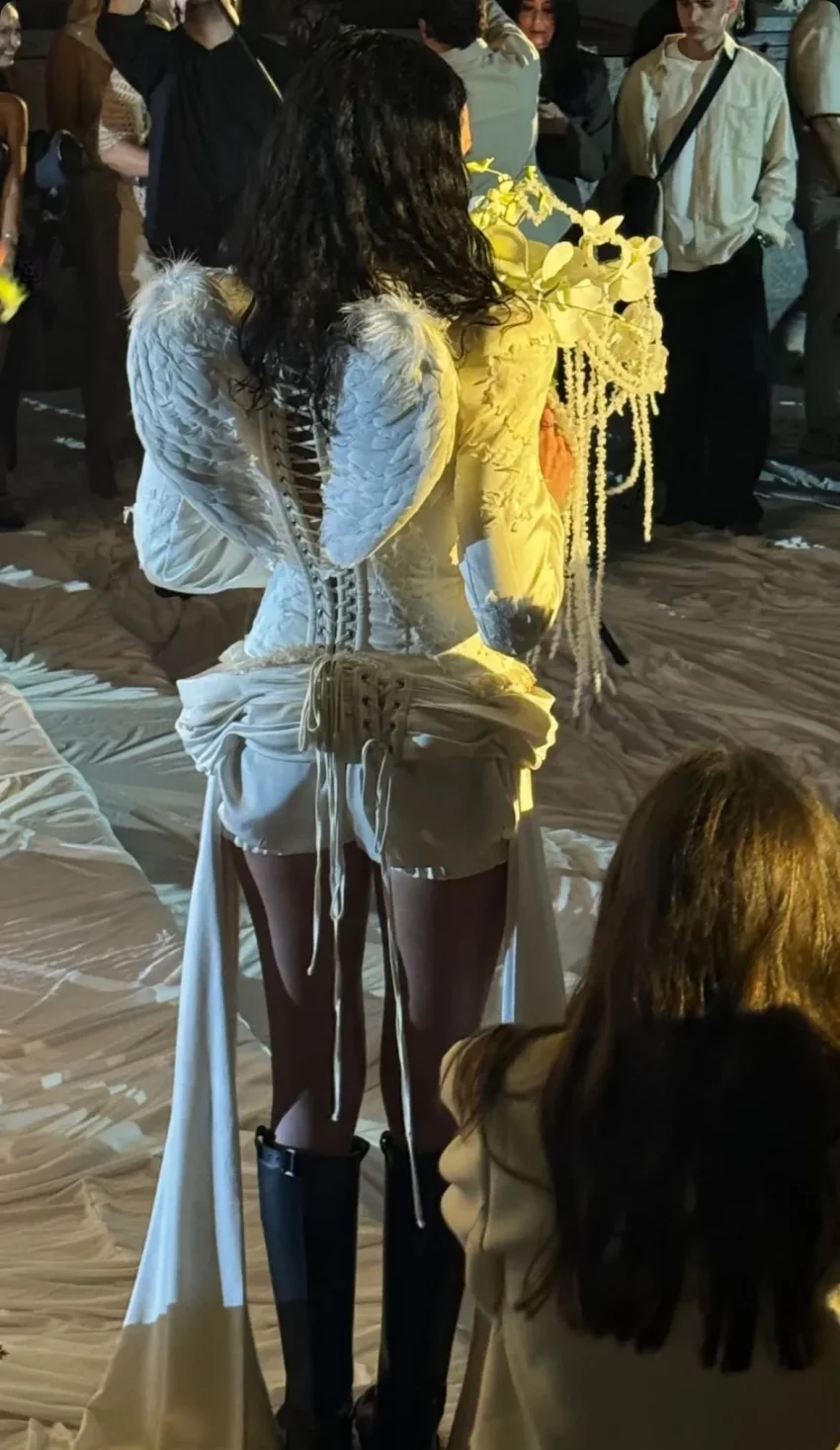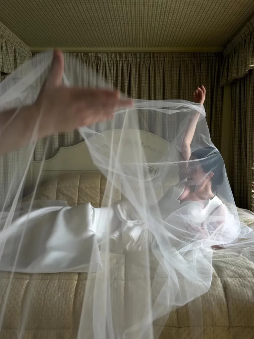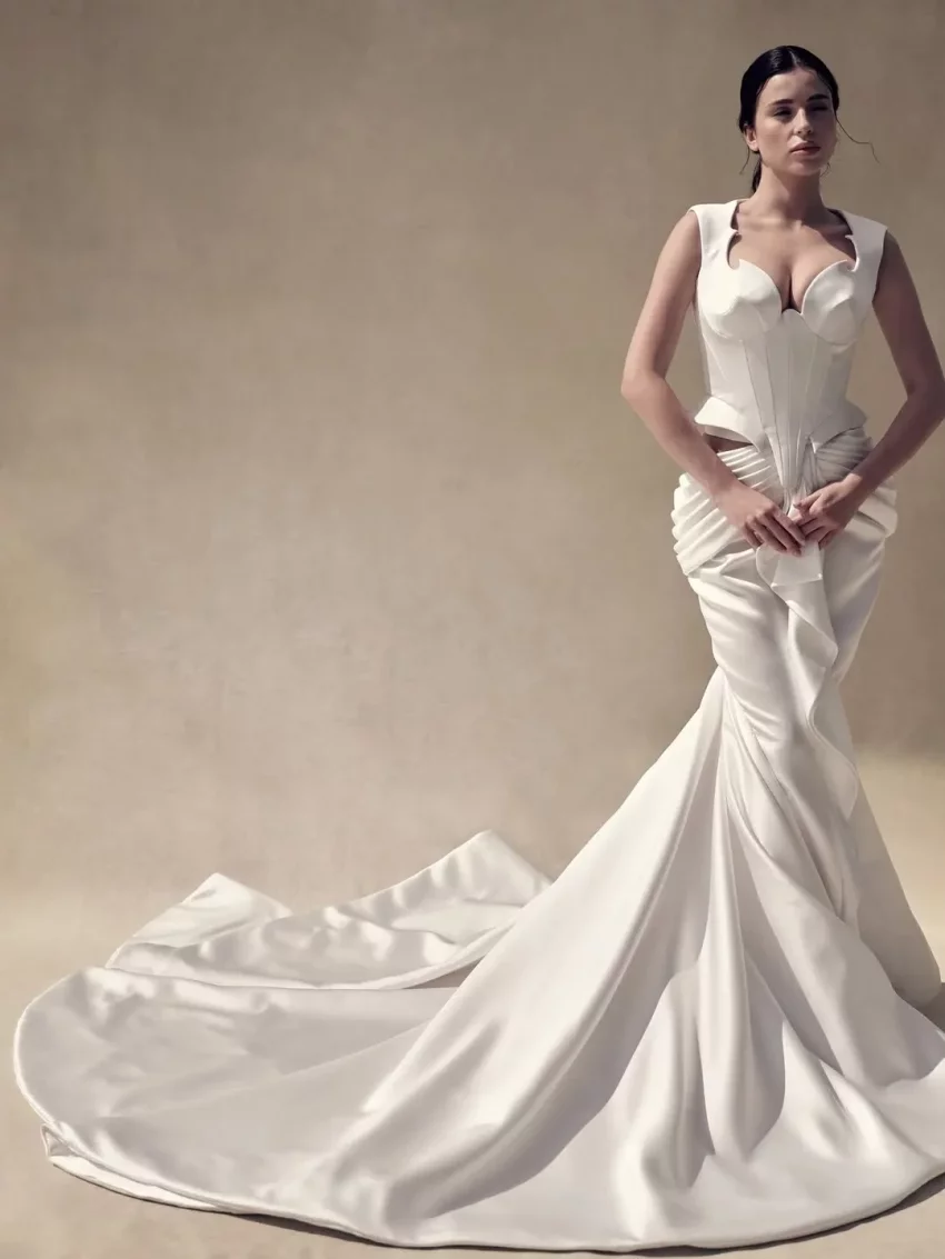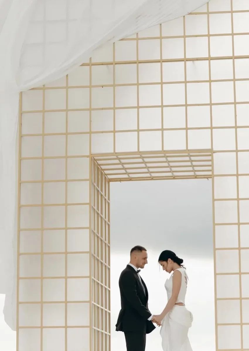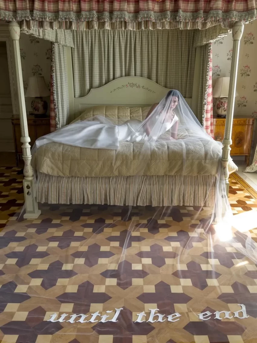 Адель ВейгельОсновную часть церемонии невеста провела в платье Belik с вырезом в форме сердца на спине и длинной фатой с надписью Until the end ("До конца"). Похожий свадебный образ был у Хейли Бибер в 2018 году, только на её фате была вышита фраза Till Death Do Us Part ("Пока смерть не разлучит нас").