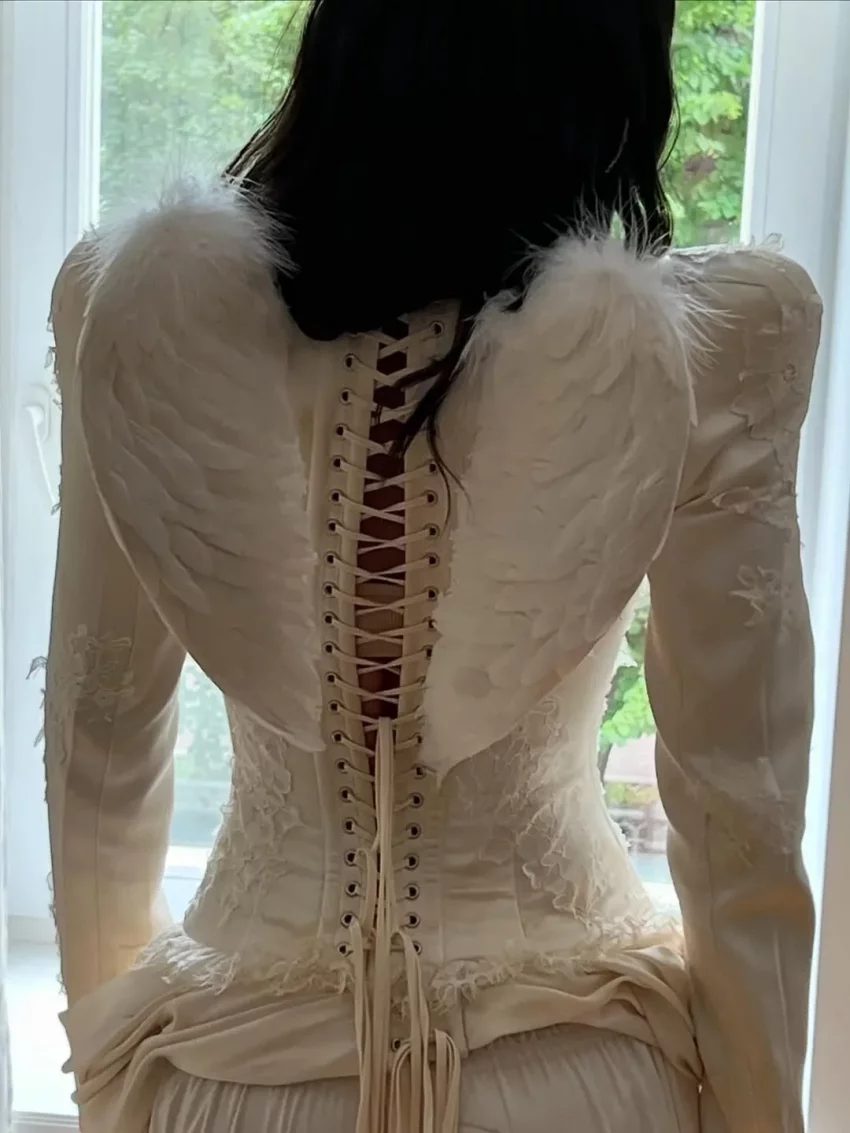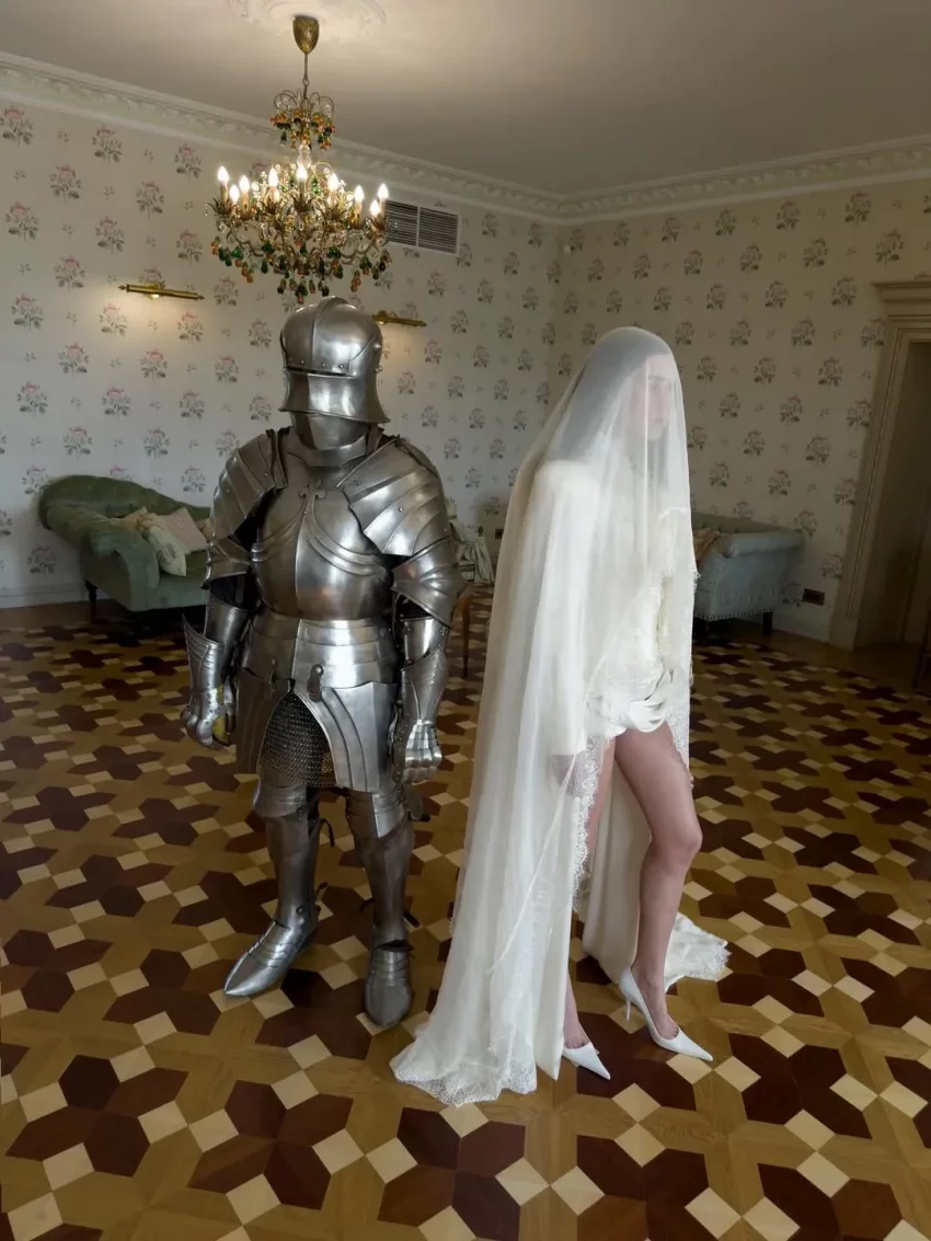 Вторым образом Адель стал жакет с крыльями и юбка-шорты в стиле нижнего белья XVIII века с шёлковыми драпировками авторства молодого дизайнера Ильи Мигмуна, который работал над "вампирским" платьем Виктории Салават. Образ дополнили белые туфли Vetements, а из украшений на невесте было только обручальное кольцо. "Потому что это реально на века", — объяснили свой выбор стилисты изданию The Blueprint. Жених нарядился в рыцаря, и молодожёны устроили парную фотосессию в одном из номеров усадьбы.