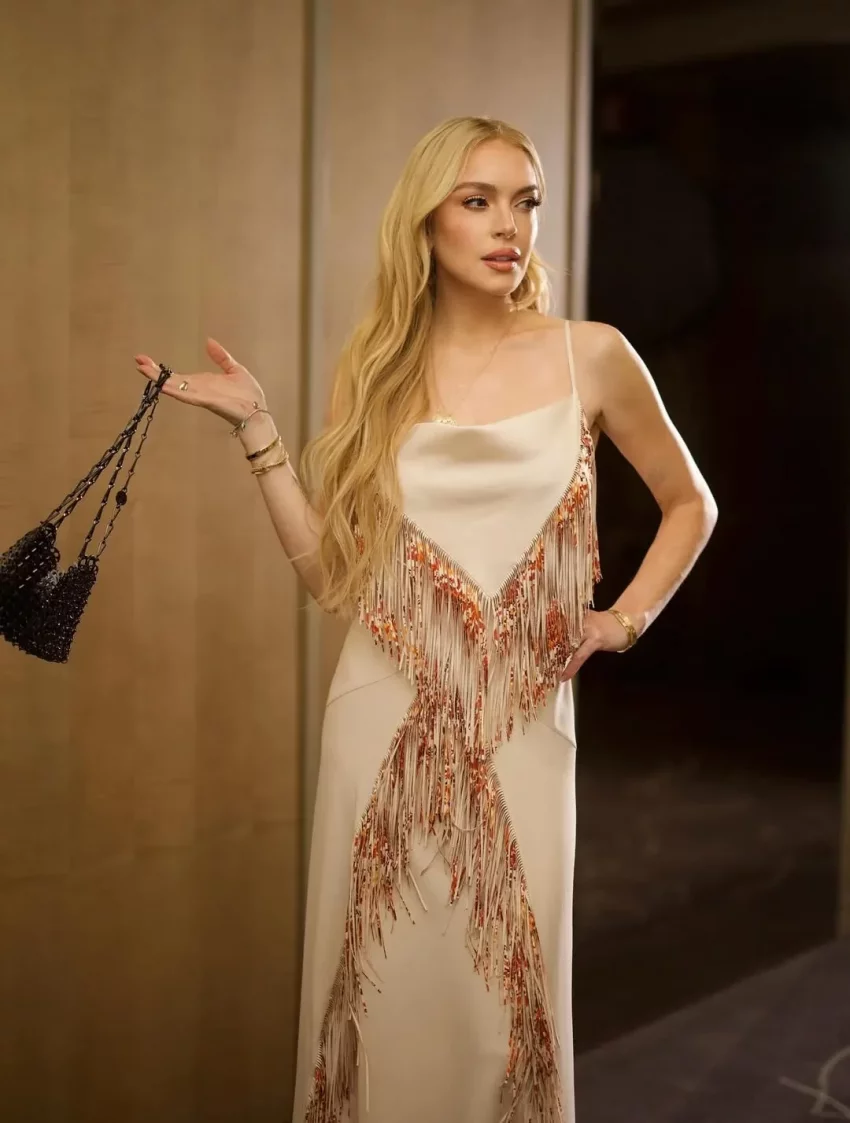 Актриса выгуляла в Мексике два новых образа. На дорожку она вышла в барбикор-стиле: она надела платье Balmain и босоножки Christian Louboutin цвета фуксии, дополнив наряд клатчем и помадой в тон. Так же Лохан примерила платье с бахромой от Rabanne и в обуви Paris Texas.
