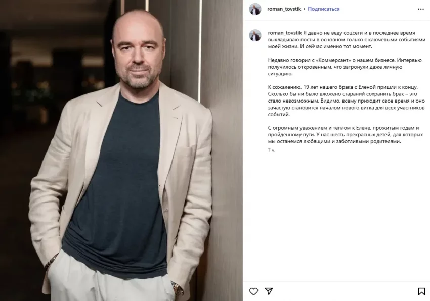 Роман ТовстикПолина Диброва (слева) на выписке Елены Товстик из роддомаПримечательно, что сам Товстик уже сообщил о разводе с Еленой, опубликовав соответствующий пост в инстаграме*: "К сожалению, 19 лет нашего брака с Еленой пришли к концу. Сколько бы ни было вложено стараний сохранить брак – это стало невозможным. Видимо, всему приходит своё время, и оно зачастую становится началом нового витка для всех участников событий. С огромным уважением и теплом к Елене, прожитым годам и пройденному пути. У нас шесть прекрасных детей, для которых мы останемся любящими и заботливыми родителями".