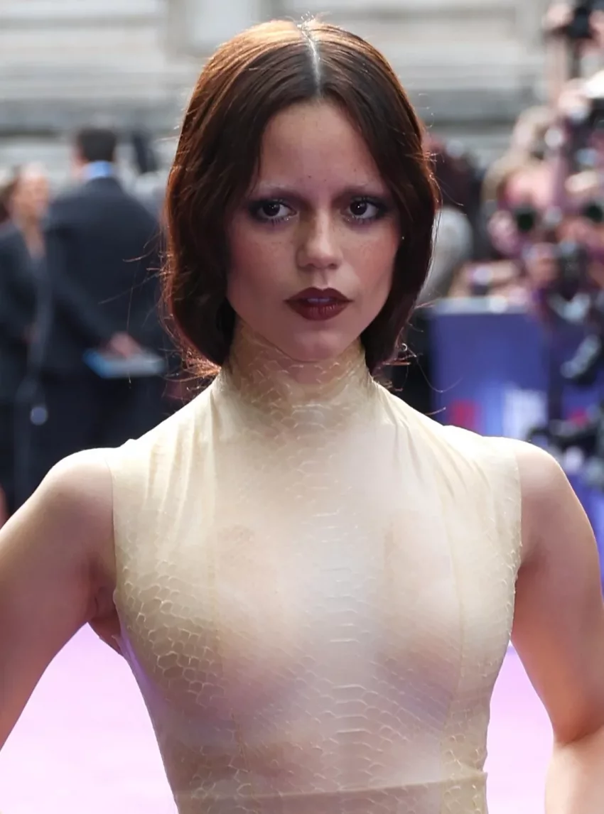 Дженна Ортега стала главной звездой мировой премьеры второго сезона сериала "Уэнсдей", где она играет главную роль. 22-летняя актриса произвела настоящий фурор своим образом: она выбрала кутюрное полупрозрачное платье с имитацией чешуи от Ashi Studio (примечательно, что коллекция, в которую входит этот наряд, была вдохновлена историями известных серийных убийц прошлого), которое в сети уже окрестили "восковым". Образ она дополнила серебряными кольцами Rainbow K, свободно заплетённой косой и макияжем с обесцвеченными бровями и акцентом на глаза и губы.