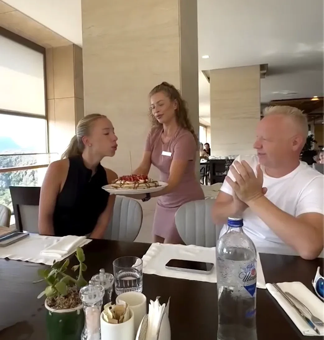 Анастасия собралась вместе с гостями на праздничном завтраке в отеле, в котором остановилась семья, и задула свечу на торте. Рядом с именинницей сидел её отец, фото которого в сети появляются крайне редко.