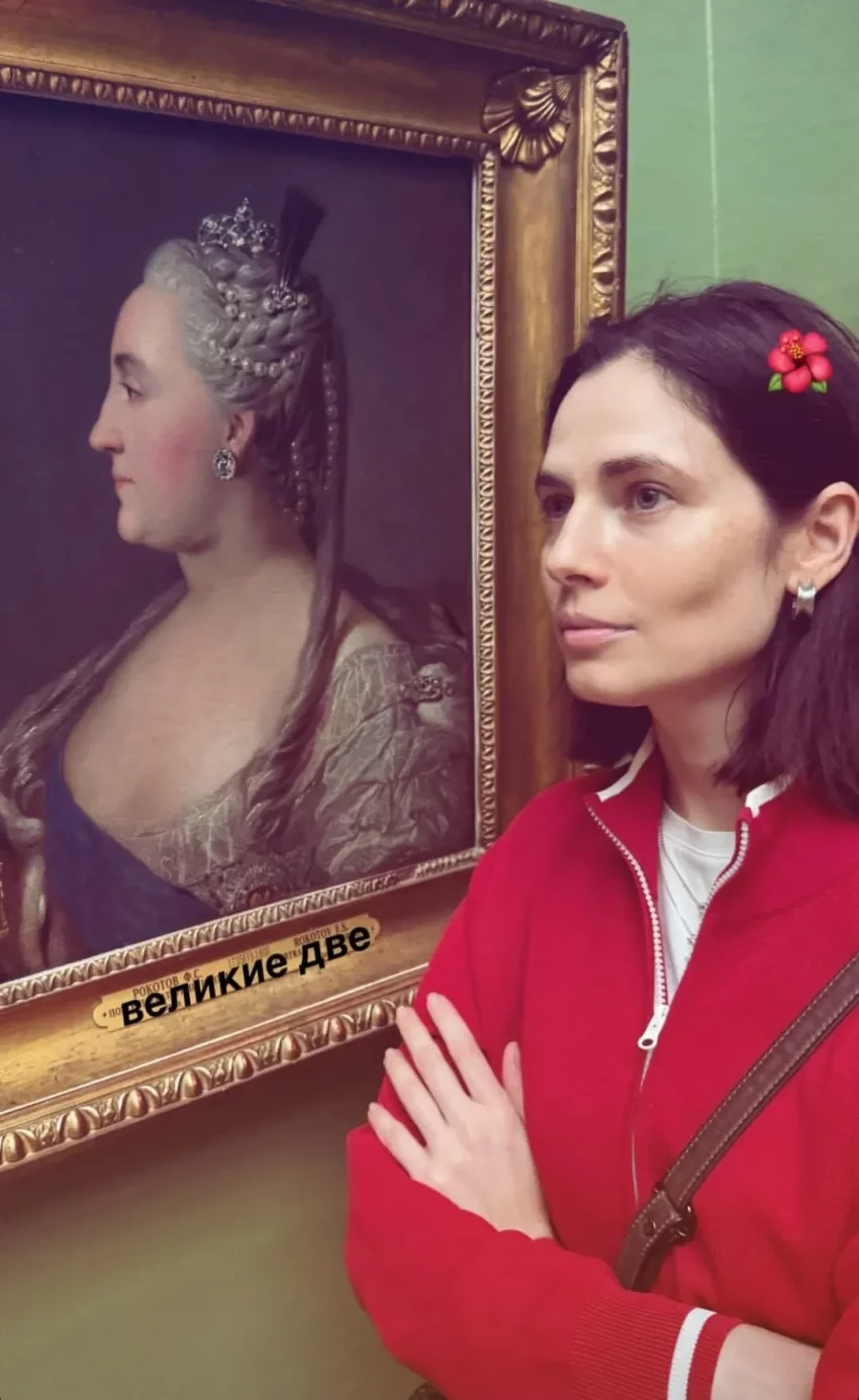 Актёр опубликовал серию фотографий, на которых он и Юлия позируют на фоне картин. Так, на одном из снимков Снигирь стоит у портрета российской императрицы Екатерины II. “Великие две”, — подписал Евгений этот кадр.