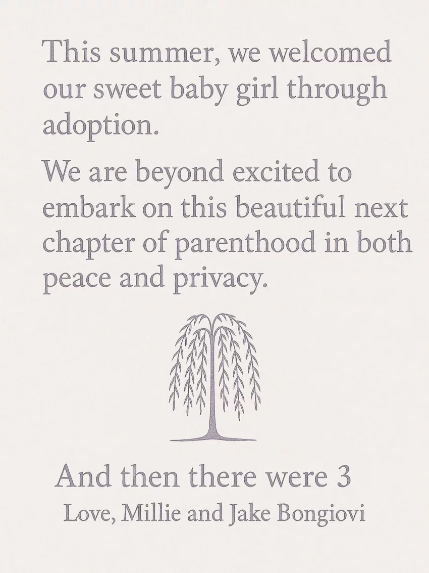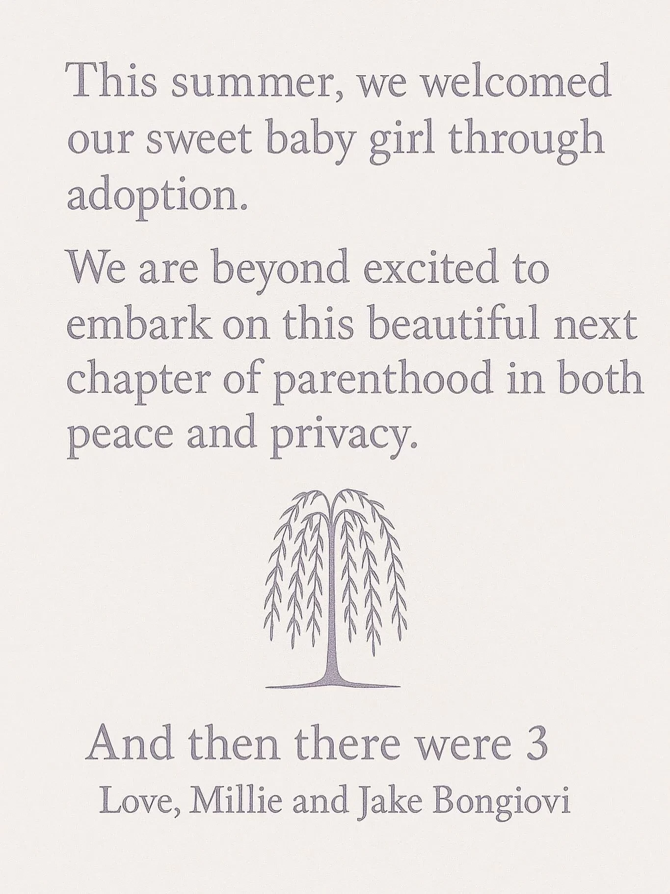 "Этим летом в нашу семью пришло счастье — мы усыновили чудесную девочку. С огромным трепетом начинаем новый этап родительства, полный уюта и гармонии", — гласит подпись на картинке, где изображена ива. В публикации пара также отметила: "И вот нас уже трое". При этом Милли не уточнила, когда именно это произошло, и предпочла не раскрывать имя ребёнка.