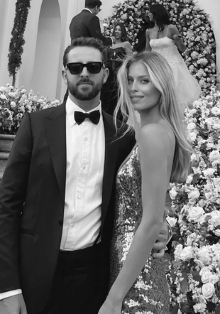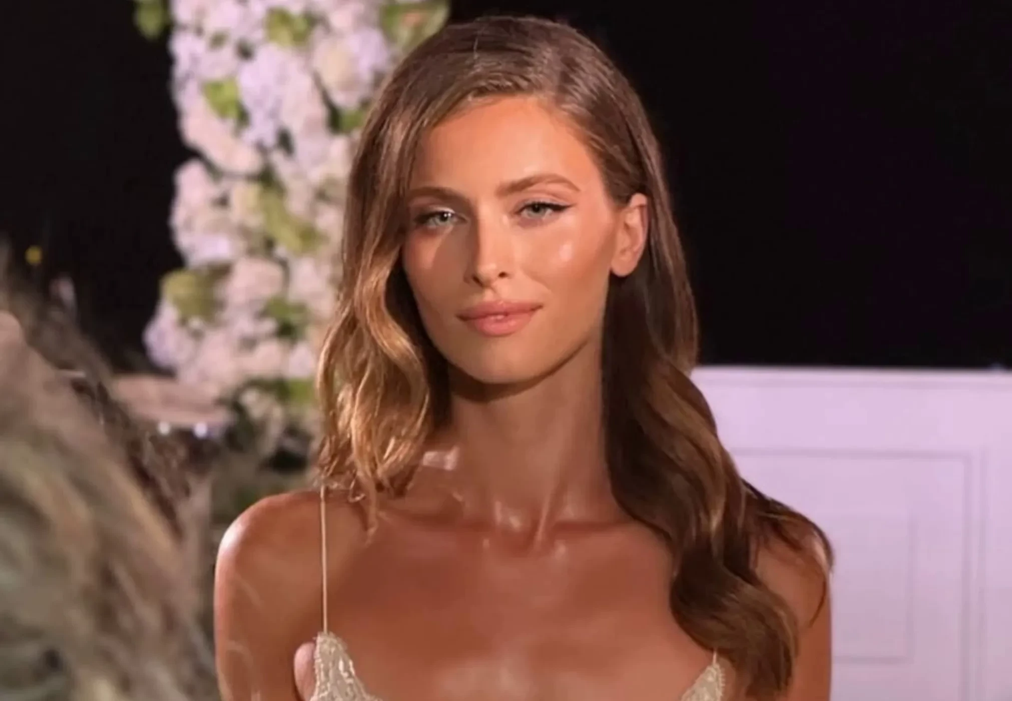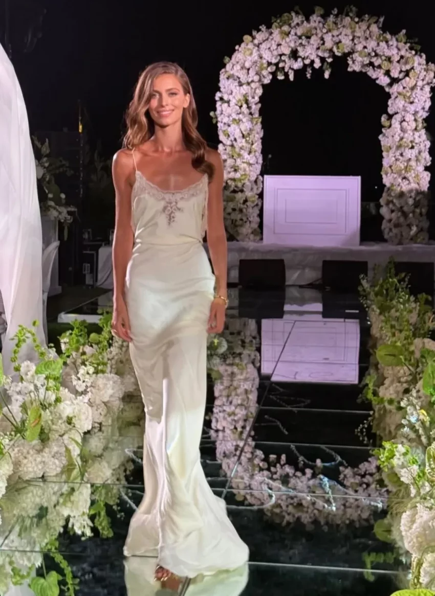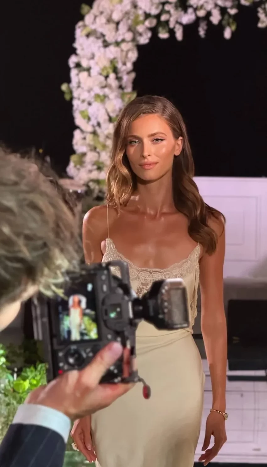 На кадрах София позирует в кремовом платье в пол на фоне свадебной арки, а также в окружении других гостей.