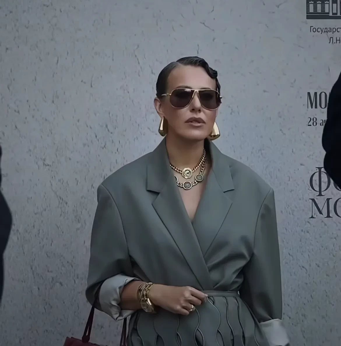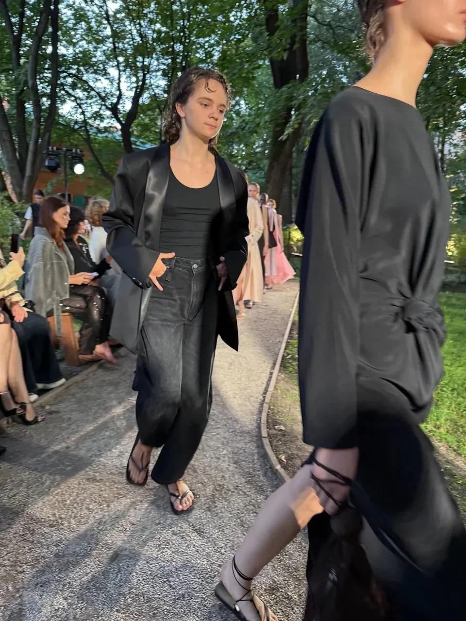 43-летняя Ксения Собчак приехала на показ сразу после линейки сына Платона. Ведущая надела костюм Ruban, который дополнила сумкой Phoebe Philo, колье Bvlgari, обувью Jil Sander и серьгами Bottega Veneta. Перед шоу Ксения встретила Светлану Бондарчук и сделала комплимент её винтажному платью Miu Miu.