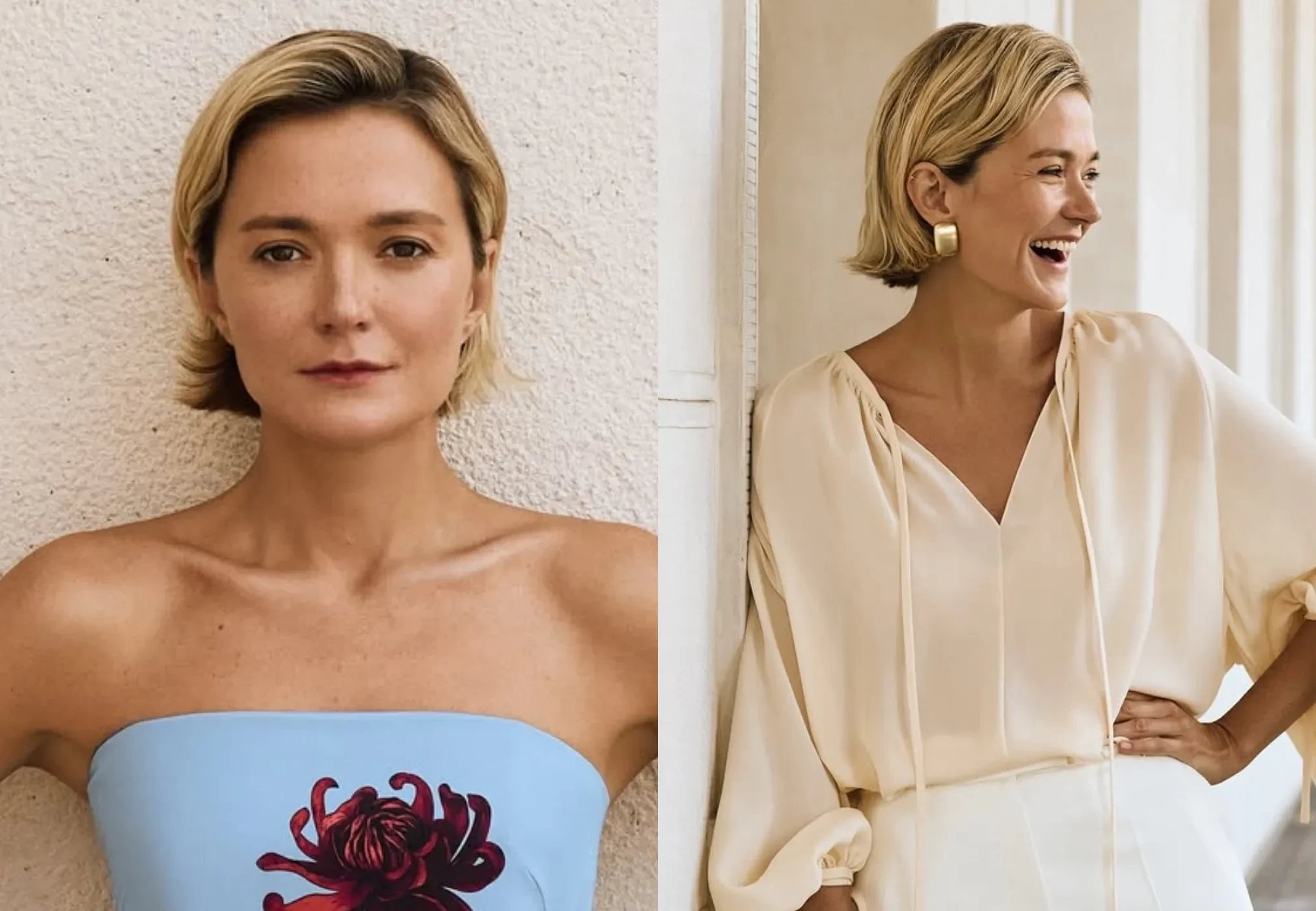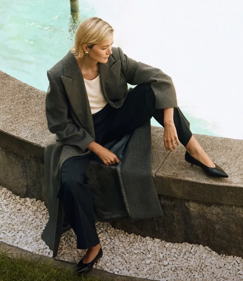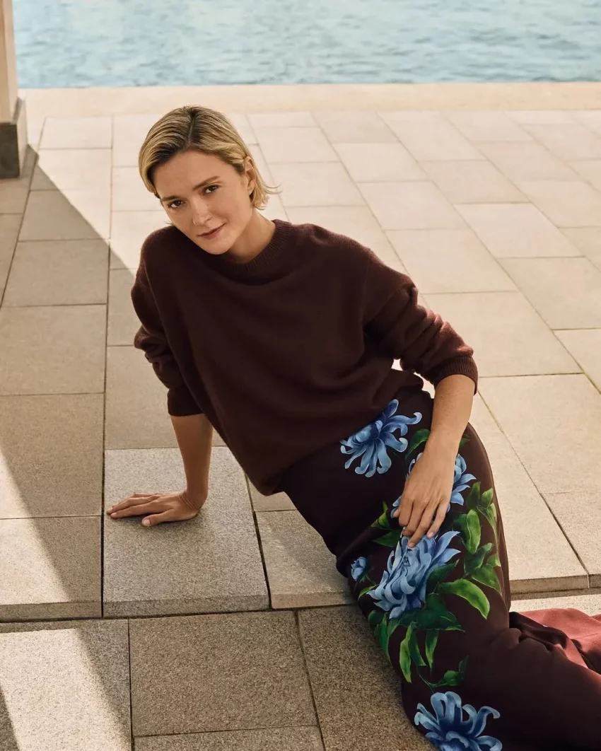 Для фотосессии Надежда примерила платье и юбку с георгинами, красное платье из шёлка, костюм из твида, шерстяное пальто и другие изделия из новой коллекции бренда.