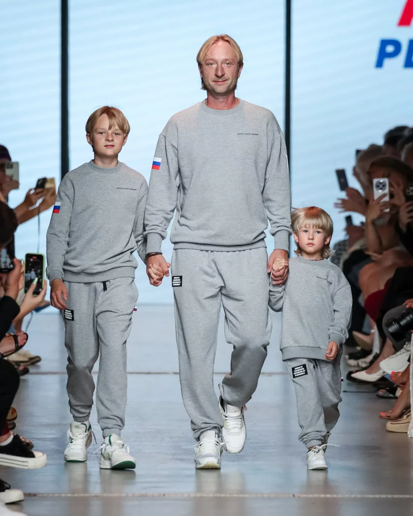 Александра Трусова и Макар ИгнатовЕвгений Плющенко, который недавно сделал блефаропластику, тоже вышел на подиум в одинаковых костюмах с сыновьями от Яны Рудковской.