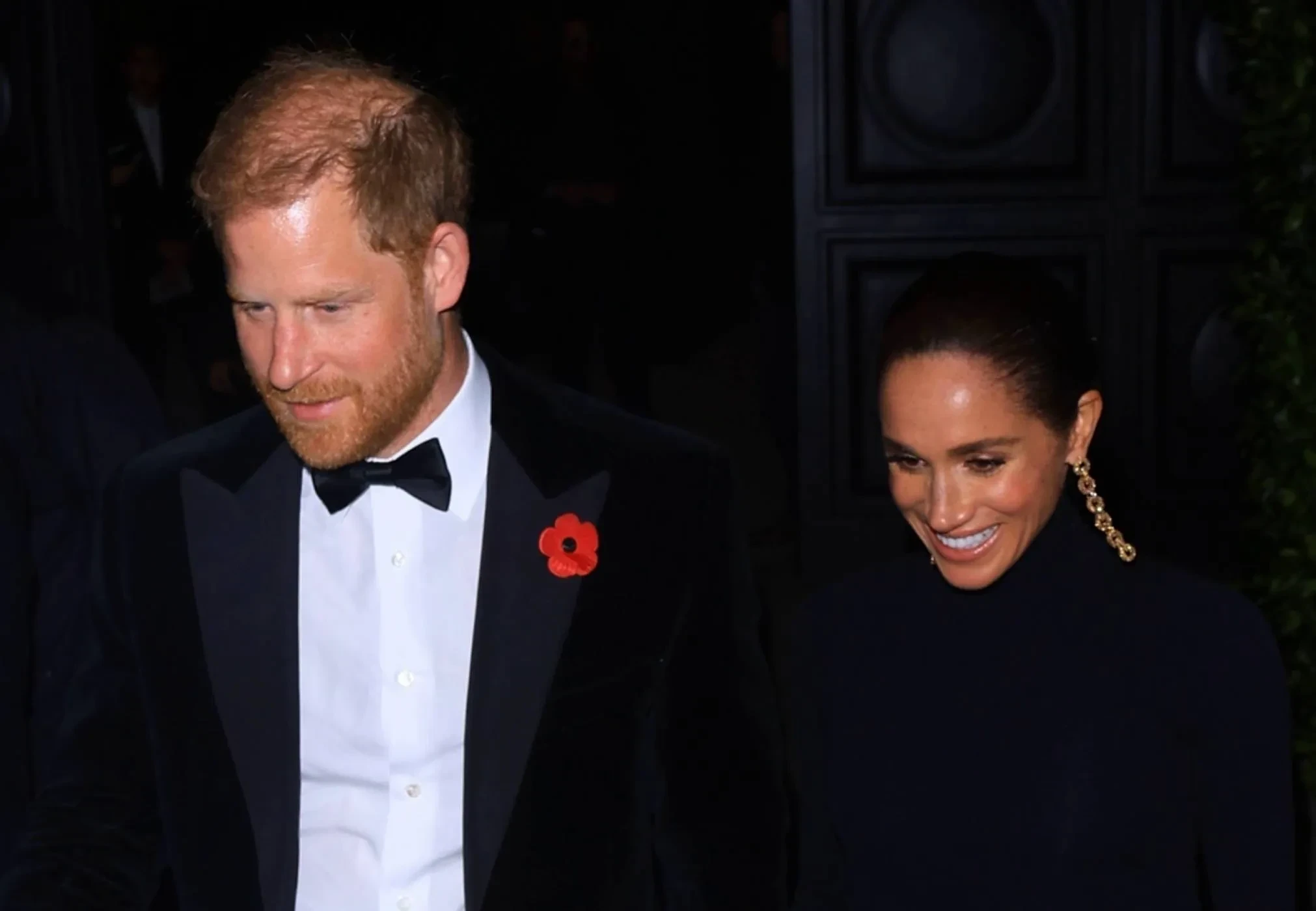 Герцогиня Сассекская выбрала для вечера длинное чёрное платье с высоким воротом и длинным разрезом на юбке, а её муж пришёл в чёрном костюме. Любопытная деталь: Гарри прикрепил к лацкану пиджака брошь в виде красного мака — символ Дня памяти, который сегодня отмечают в Великобритании.