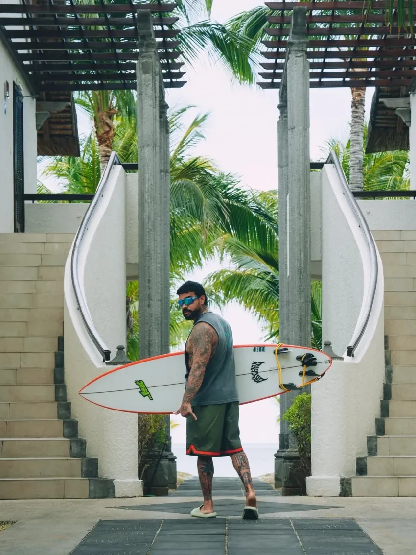 В своём инстаграме* 42-летний Тимати выложил снимки, на которых запечатлено, как он гуляет по Маврикию с переноской с трёхмесячной Эммой в одной руке и сёрфом в другой. На одном из снимков видно, что он взял с собой на морскую прогулку шестилетнего Ратмира.