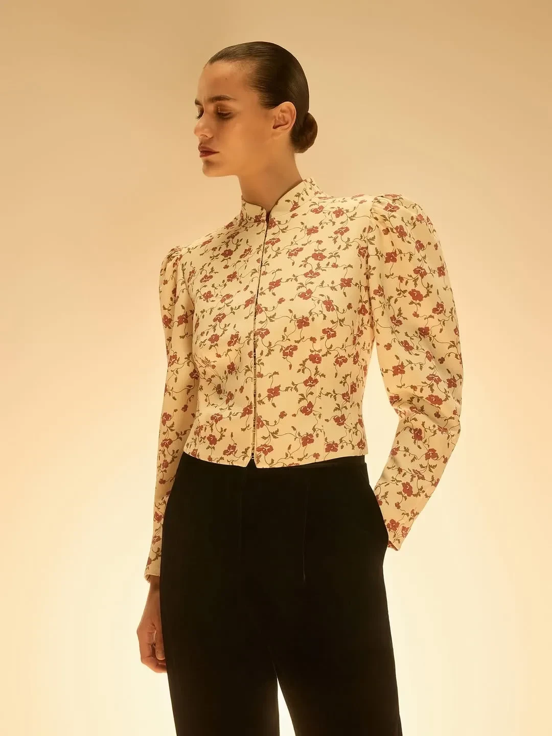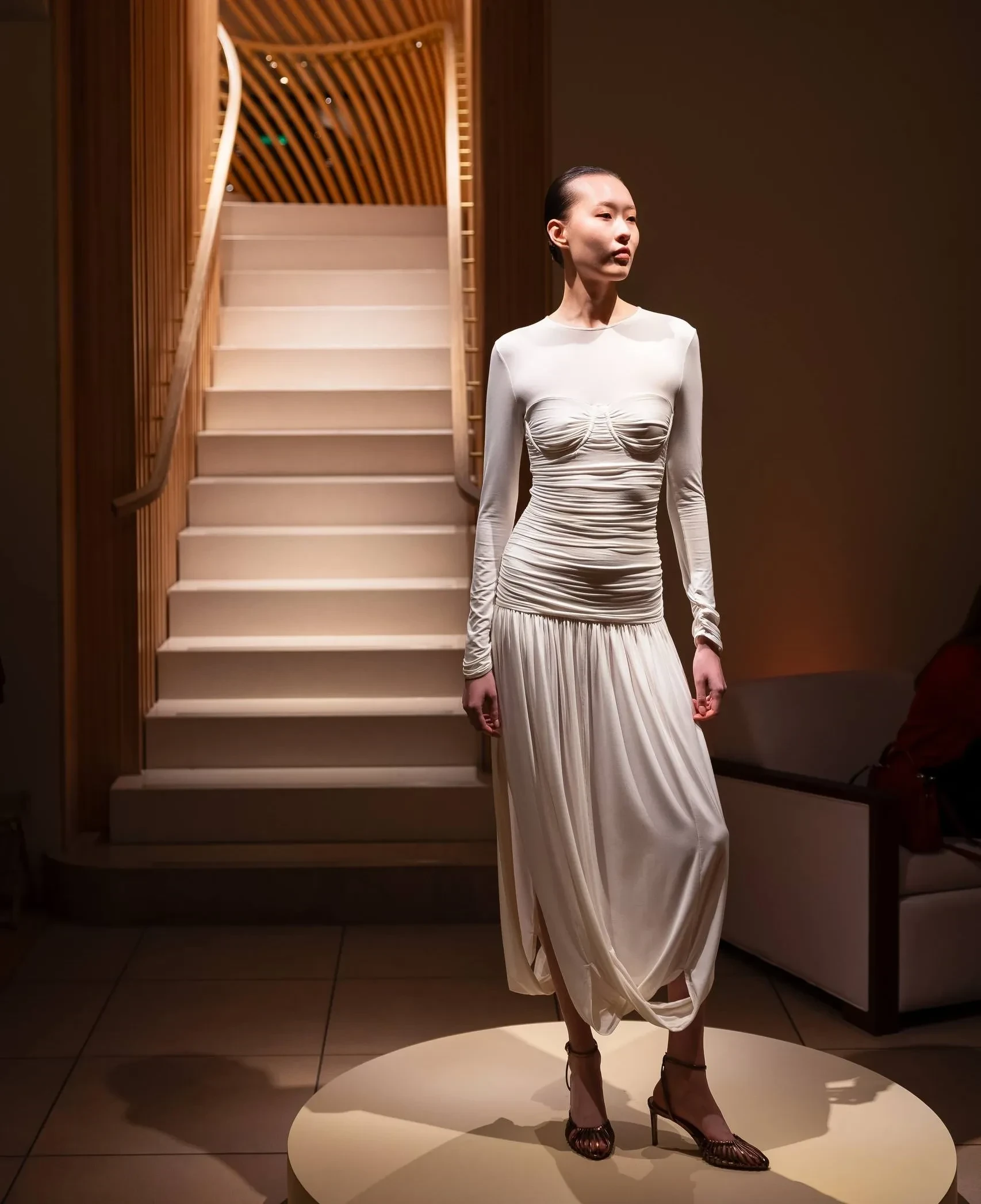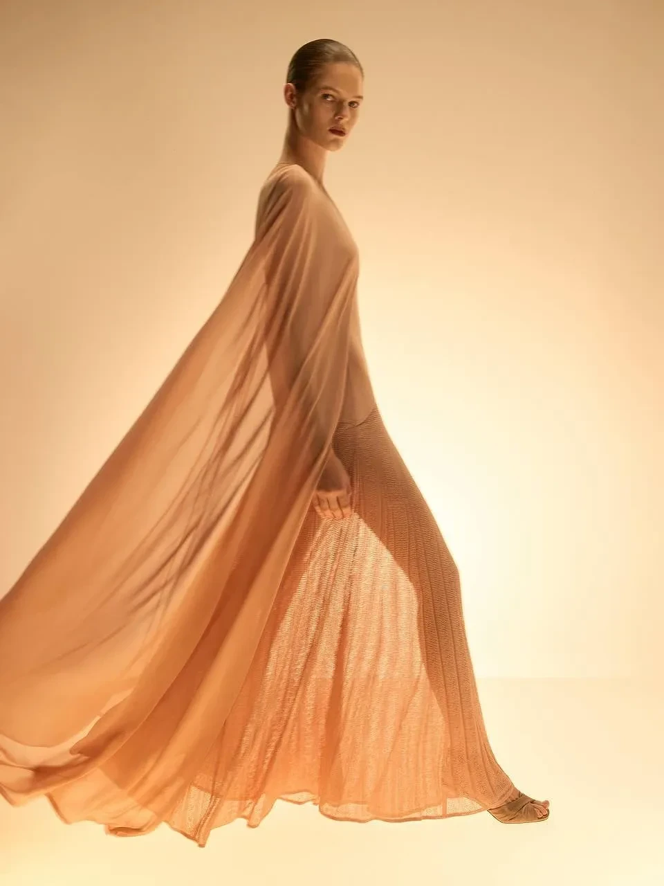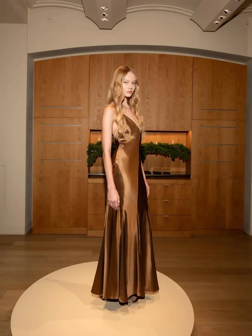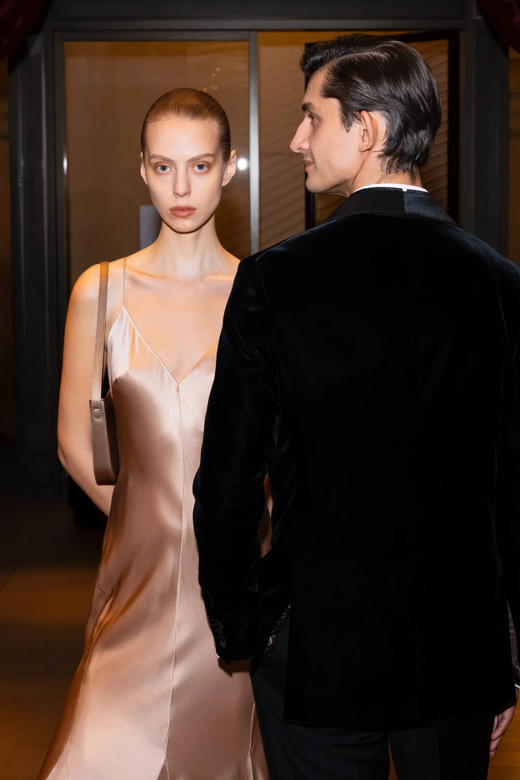 В коллекции представлены вечерние платья, комбинации из шёлка, блузы с рукавами-фонариками, топы с баской, а также мужская линейка нарядных костюмов.