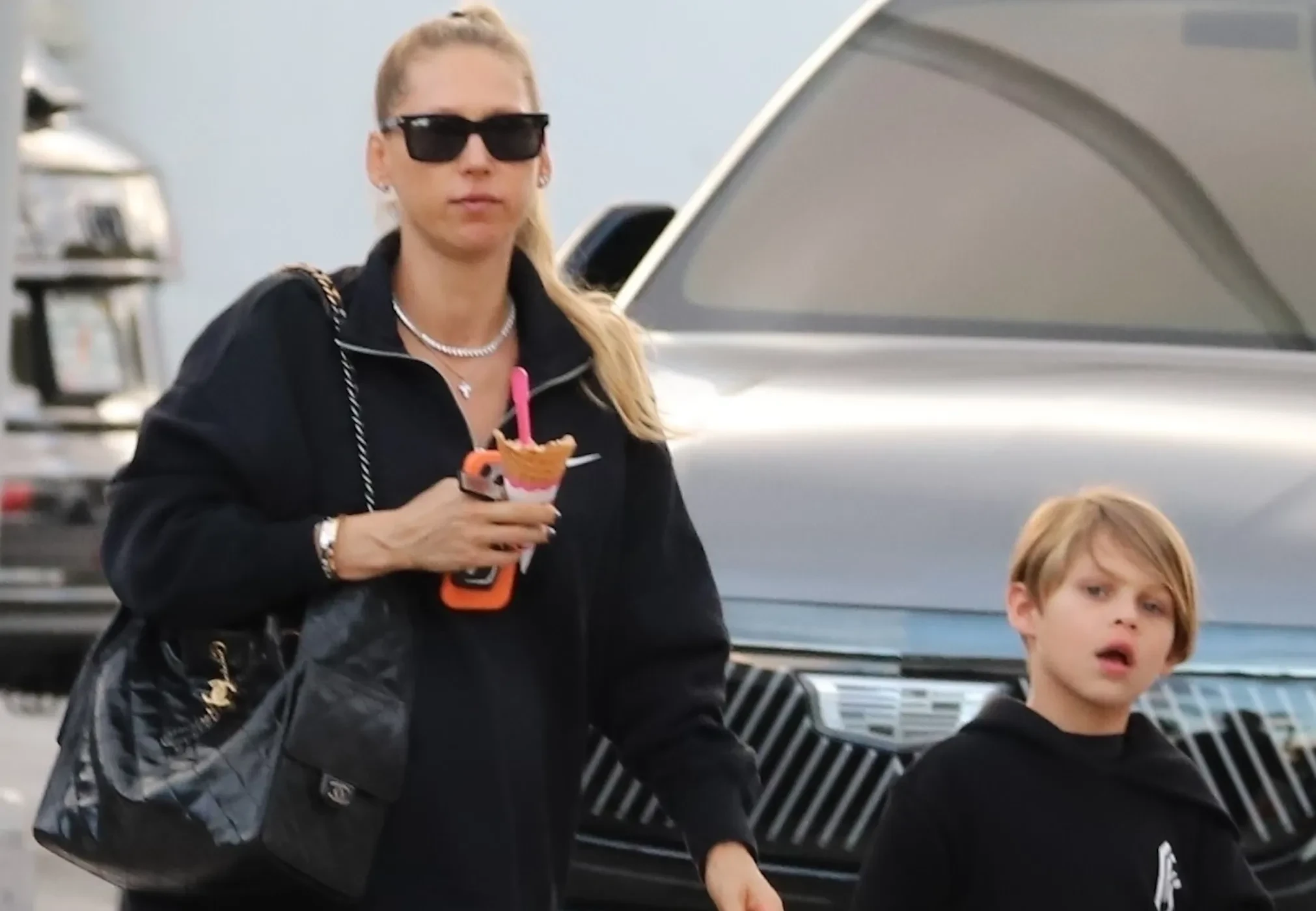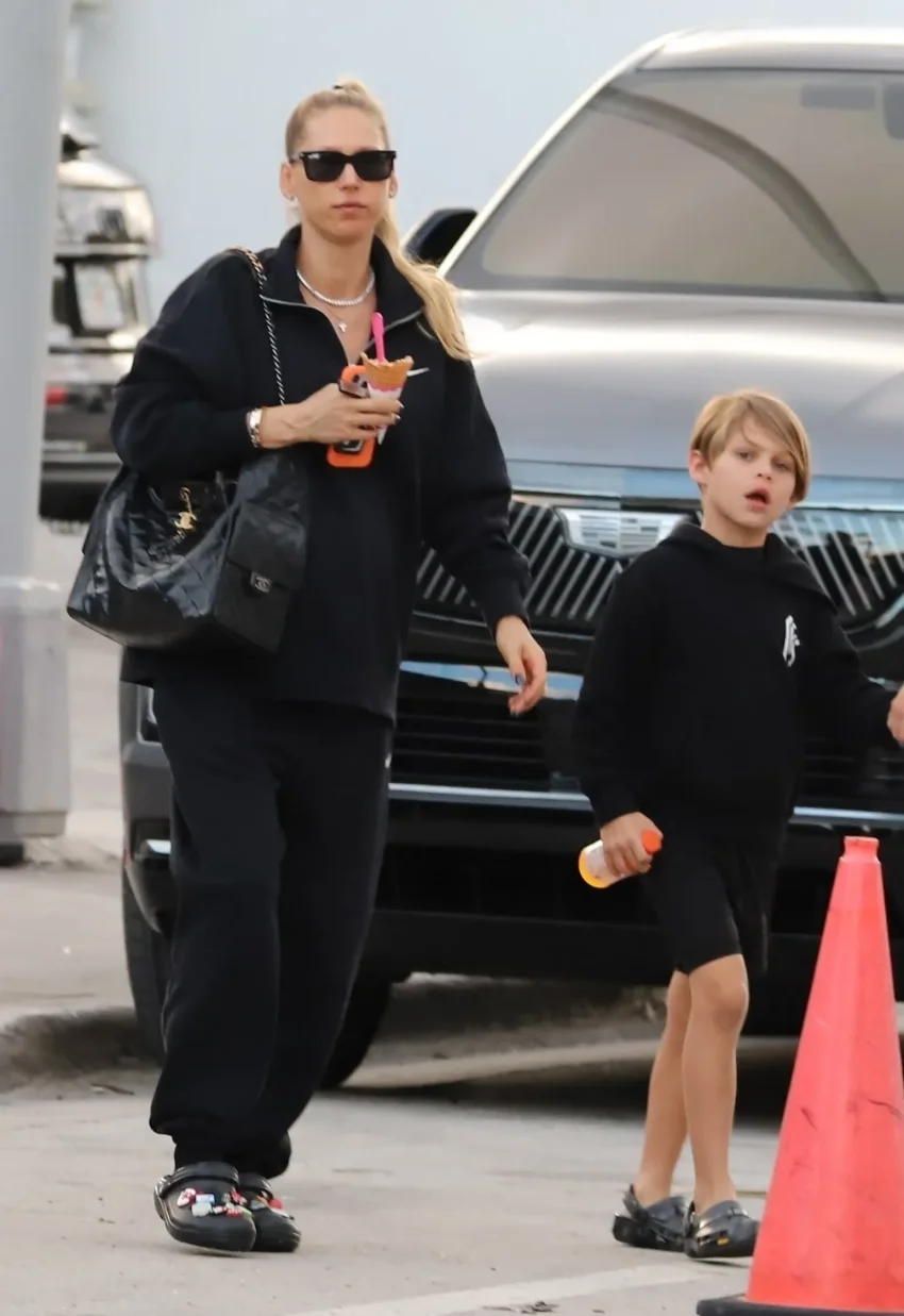 Накануне звезду тенниса засняли, когда она забирала семилетнего сына Николаса из школы. Анна была одета в чёрные спортивные брюки, свитер и кроксы. Образ дополнили солнцезащитные очки и, как всегда, сумка Chanel, а в руках Анна держала мороженое.