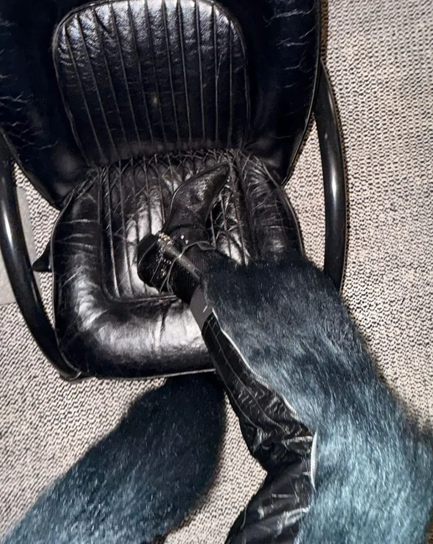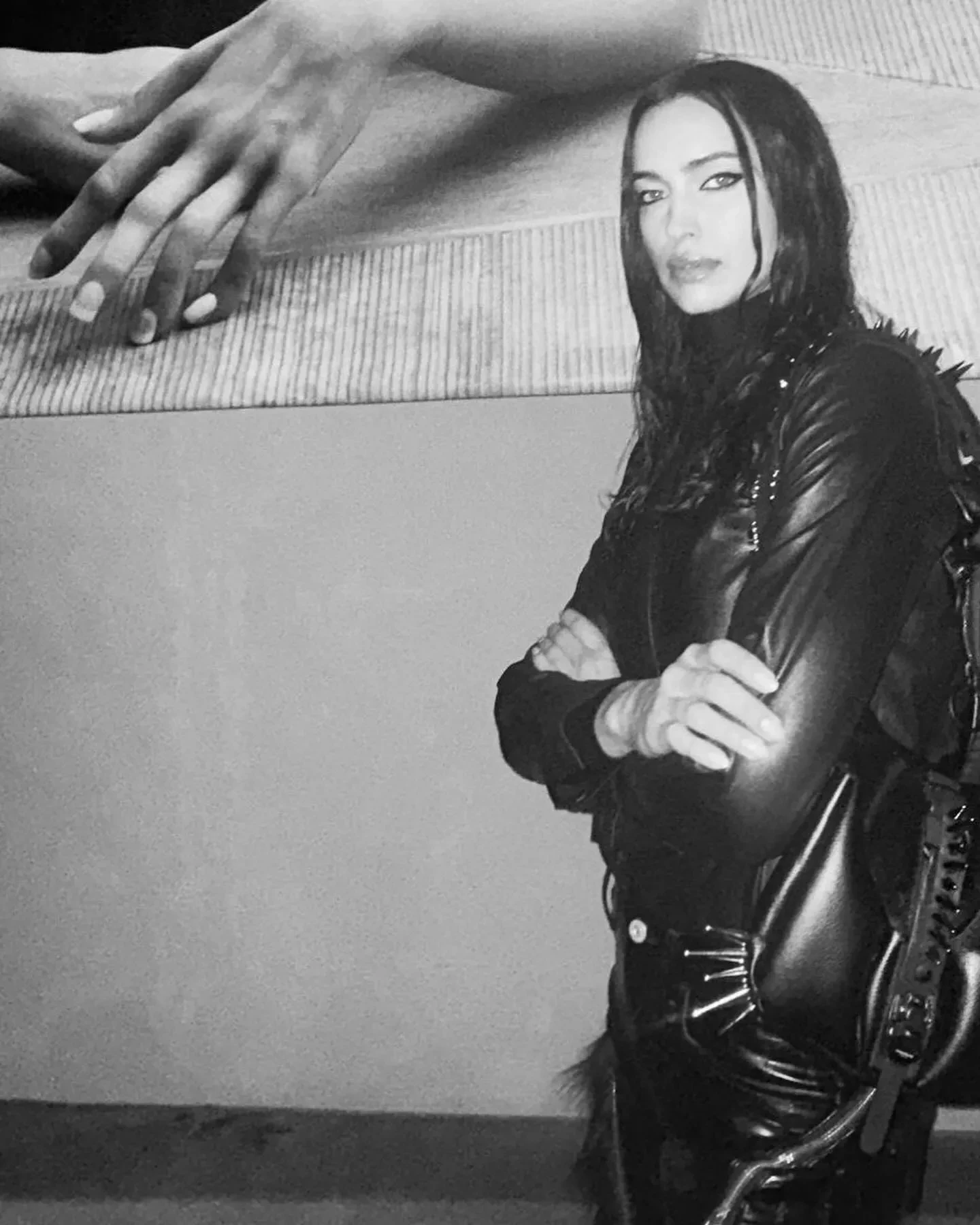 Для вечера Шейк выбрала образ total black: на ней была водолазка, кожаная рубашка и брюки с меховыми вставками. Образ модель завершила сумкой с шипами от Junya Watanabe x Inneraum, казаками и угольно-чёрными стрелками. "Вчера чествовали настоящего гения — Стивена Кляйна. Для меня огромная честь быть частью твоего мира и этого невероятного проекта. Столько любви, столько магии", — написала Ирина.