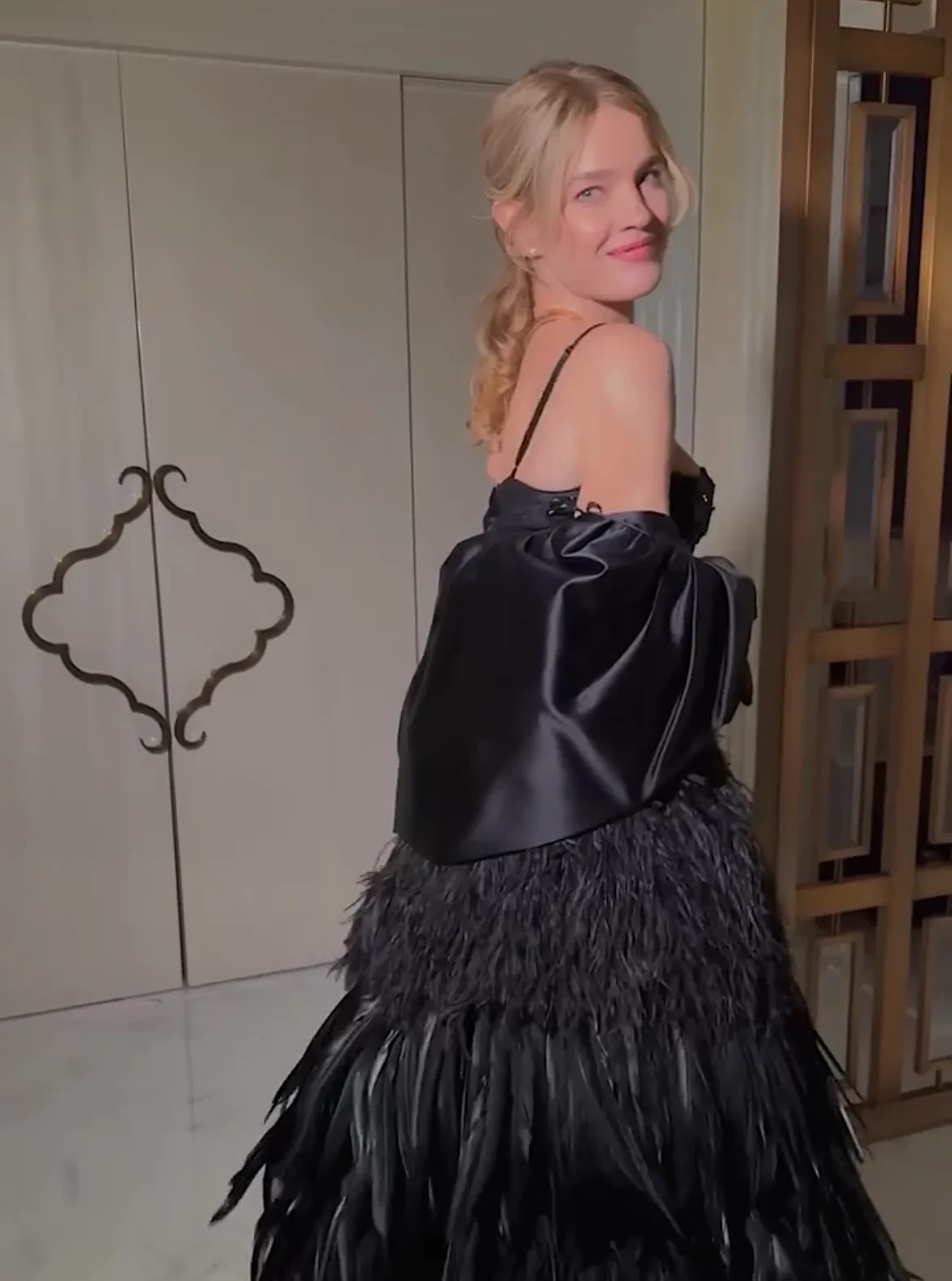 43-летняя супермодель вышла на дорожку в чёрном платье Dolce & Gabbana Alta-Moda с корсетом и объёмной юбкой с перьями из коллекции 2025 года. На создание образа стилиста Натальи Хьюго Тукаса Терзияна вдохновила героиня Натали Портман из фильма "Чёрный лебедь".