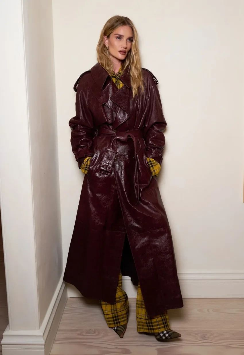 38-летняя Рози Хантингтон-Уайтли позировала на фоне дерева в тотал-луке Burberry — в бордовом кожаном плаще, брючном костюме и туфлях в фирменную клетку.