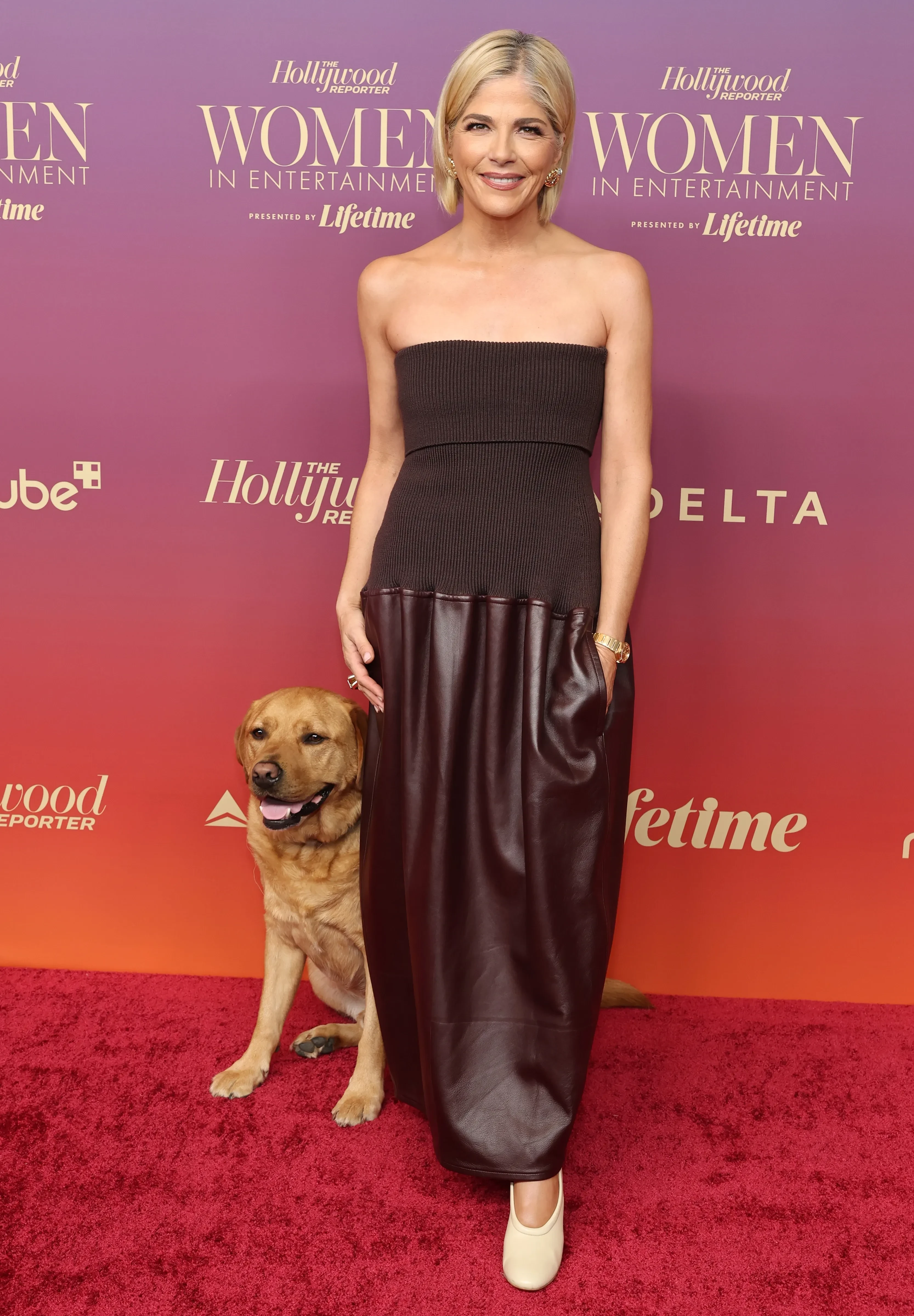 Гвинет Пэлтроу вышла на дорожку в белом платье собственного бренда Gwyn, дополнив образ красными туфлями, а 36-летняя Дакота Джонсон, которая, к слову, восемь лет встречалась с бывшим мужем Пэлтроу Крисом Мартином, позировала в платье Khaite. 56-летняя Дженнифер Лопес блистала в коричневом жакете с декольте и юбке Harith Hashim, а Сельма Блэр, которая несколько лет борется с рассеянным склерозом, пришла в платье Tods и со своей собаком-поводырём Скаутом.