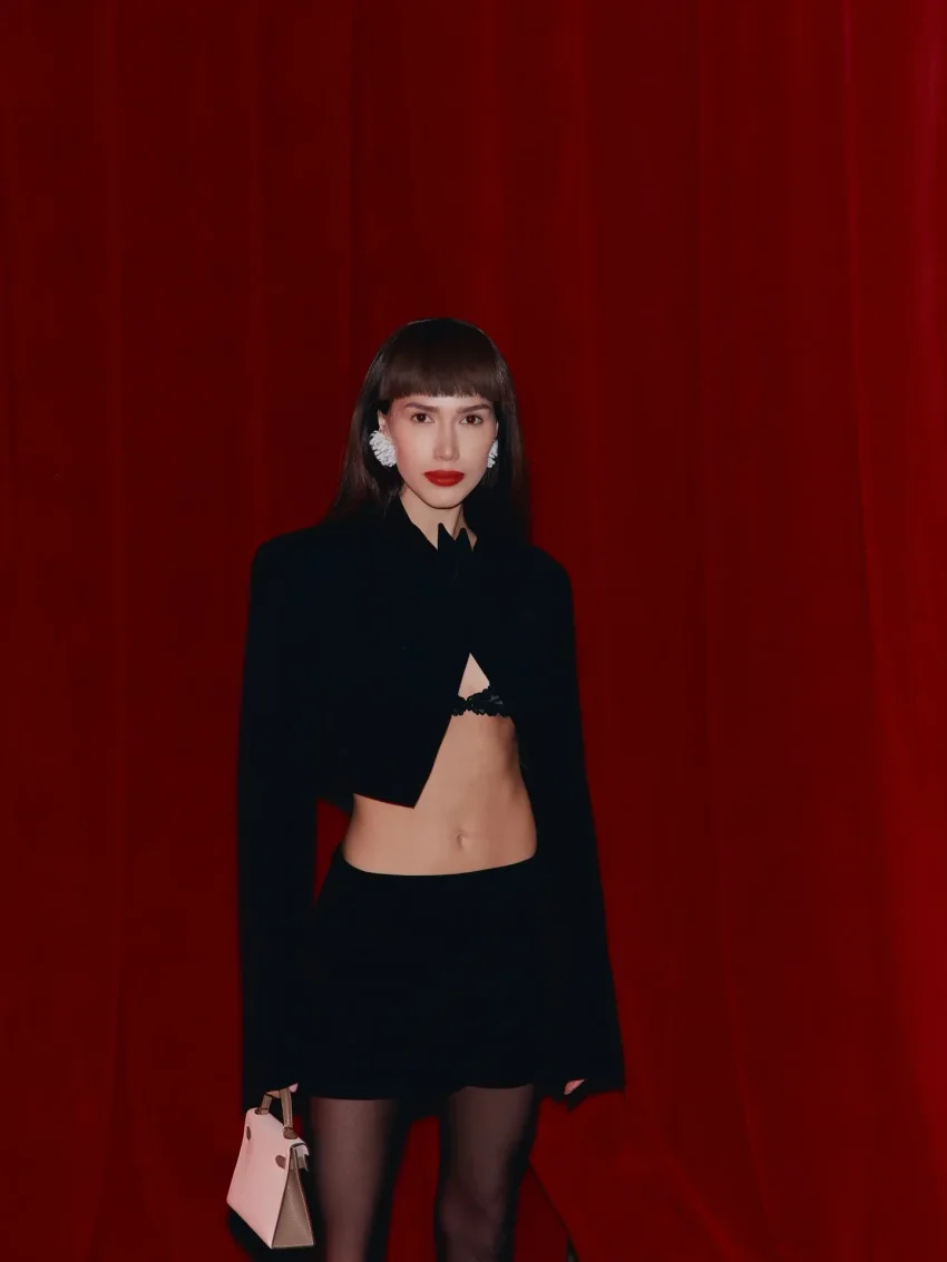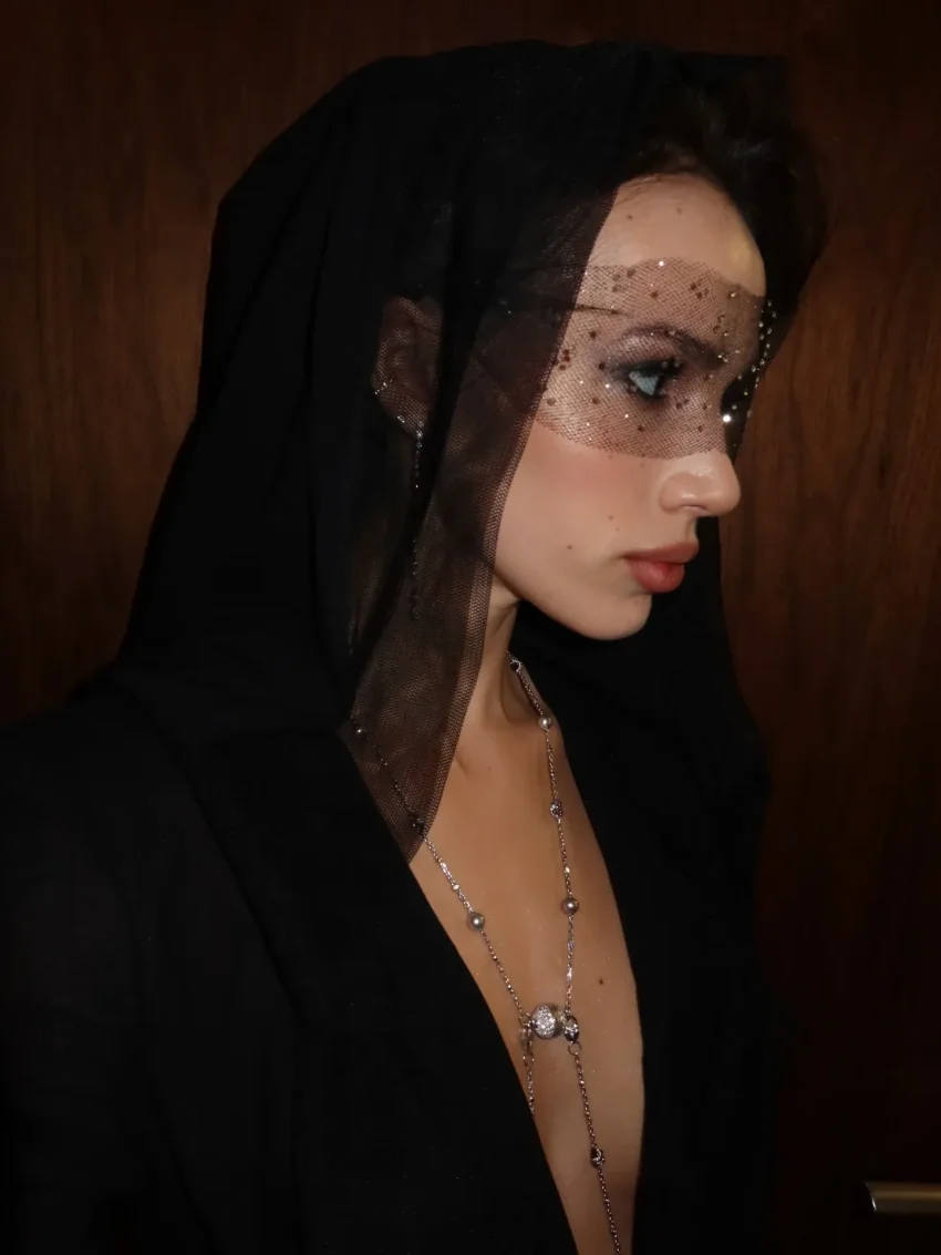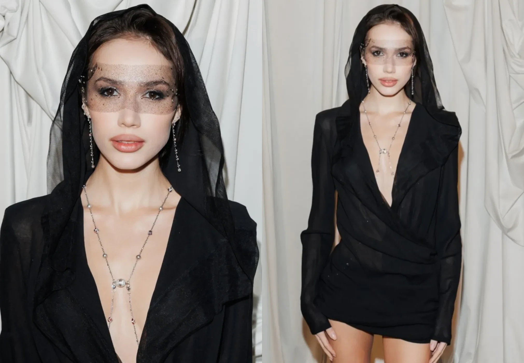 Для выхода в свет Алина выбрала чёрное мини-платье с глубоким декольте и капюшоном. Образ дополнили прозрачная маска со стразами и босоножки на шпильке.