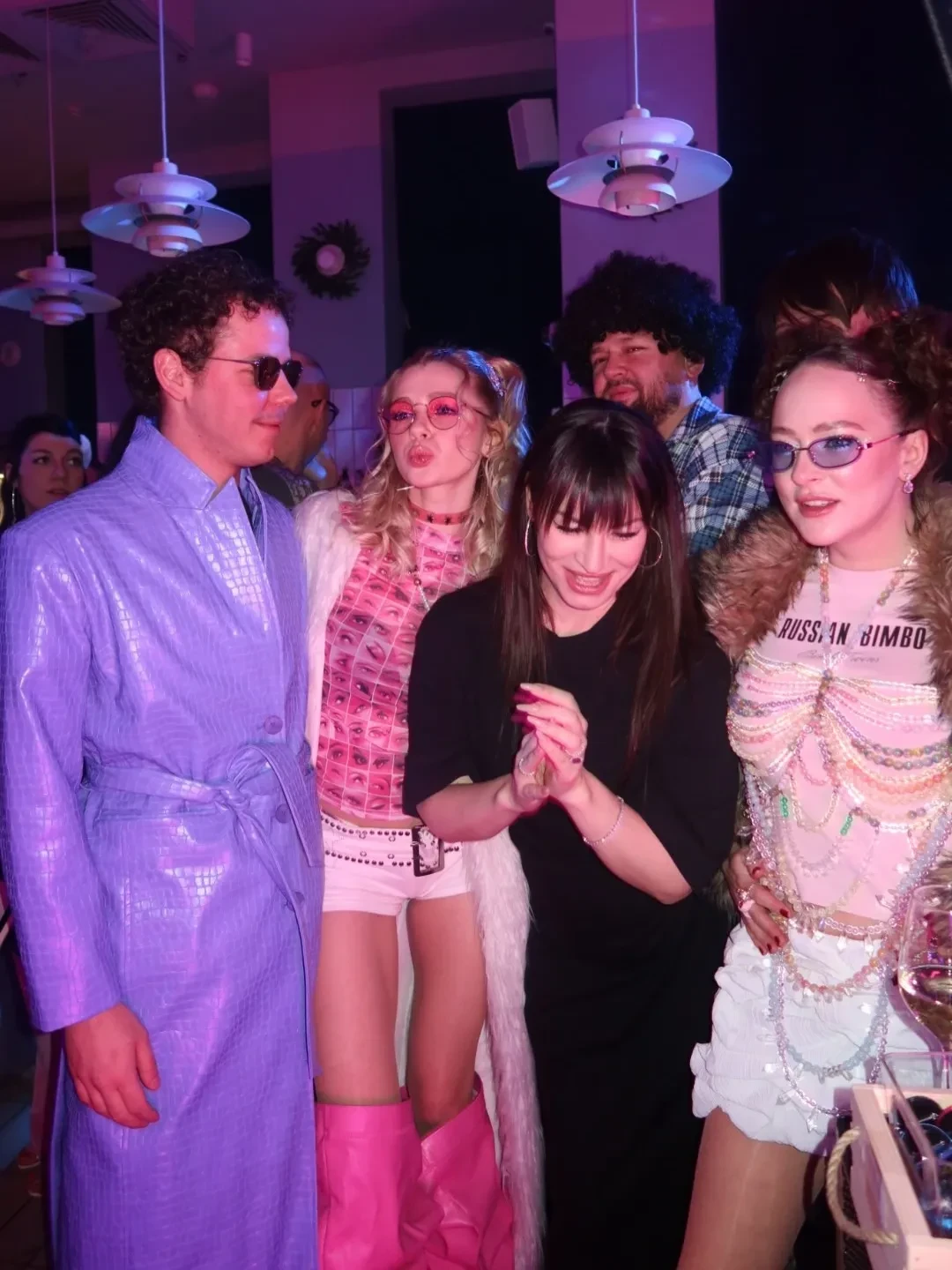 Темой вечеринки стали нулевые (вряд ли Москва успела отойти после шумной тусовки Ксении Собчак в этом же стиле), поэтому гостей просили соблюсти соответствующий дресс-код. Тарасова выбрала кроп-топ с надписью Russian Bimbo и мини-юбку из жатой ткани. Её образ дополнили бодичейн из пайеток, яркие украшения и меховые сапоги. Актриса в основном держалась рядом с подругой Анастасией Уколовой, много танцевала и даже спела в караоке.